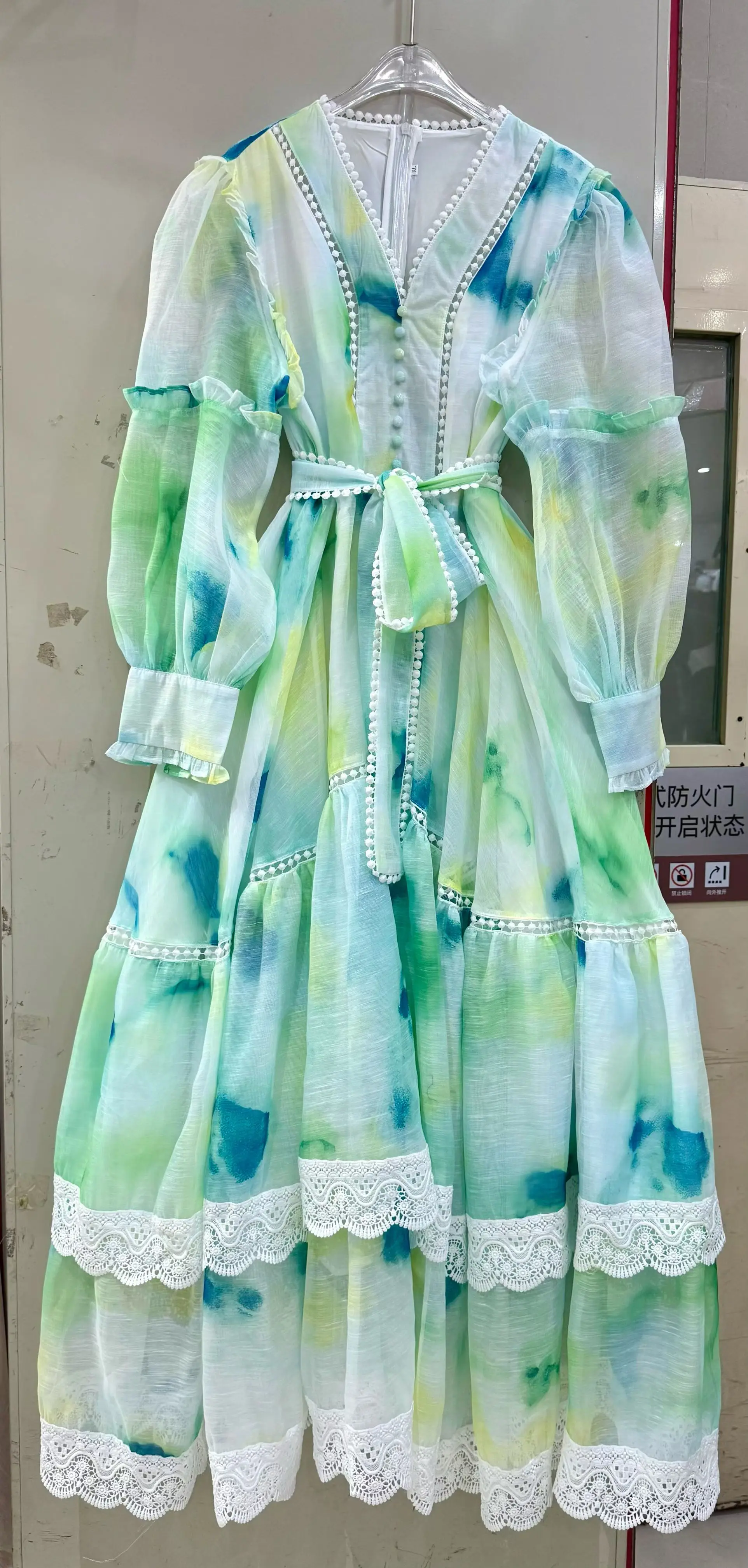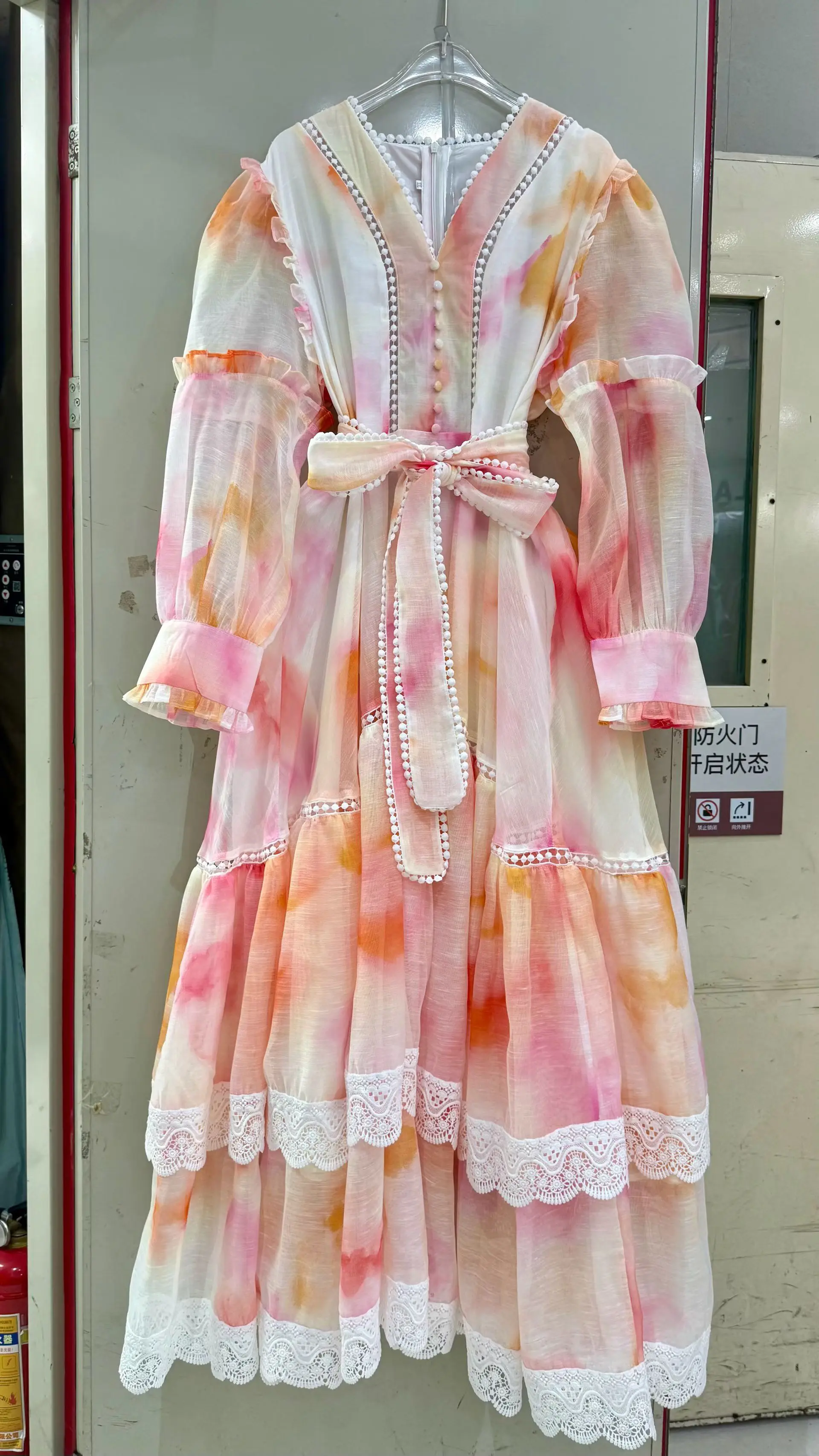 ZYHT 82053 Apricot Lace Top with Tiered Ruffled Sleeves V-Neck & Gold Buttons Blouse Wanita Elegan Women Blouse