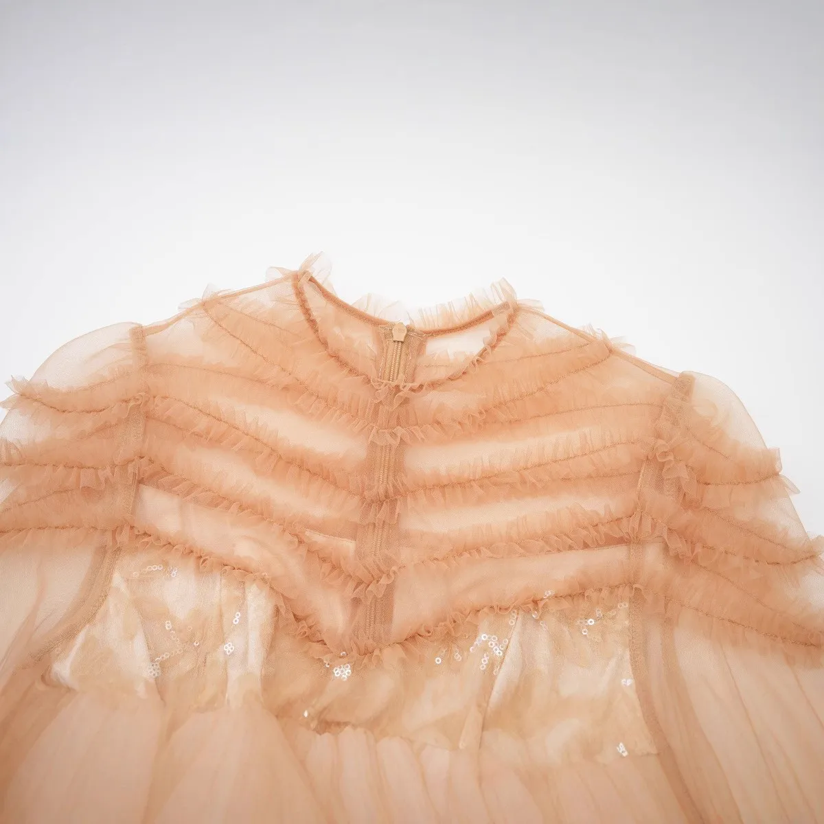 ZYHT 82053 Apricot Lace Top with Tiered Ruffled Sleeves V-Neck & Gold Buttons Blouse Wanita Elegan Women Blouse