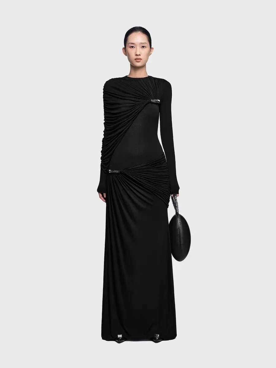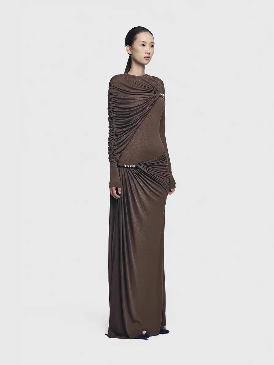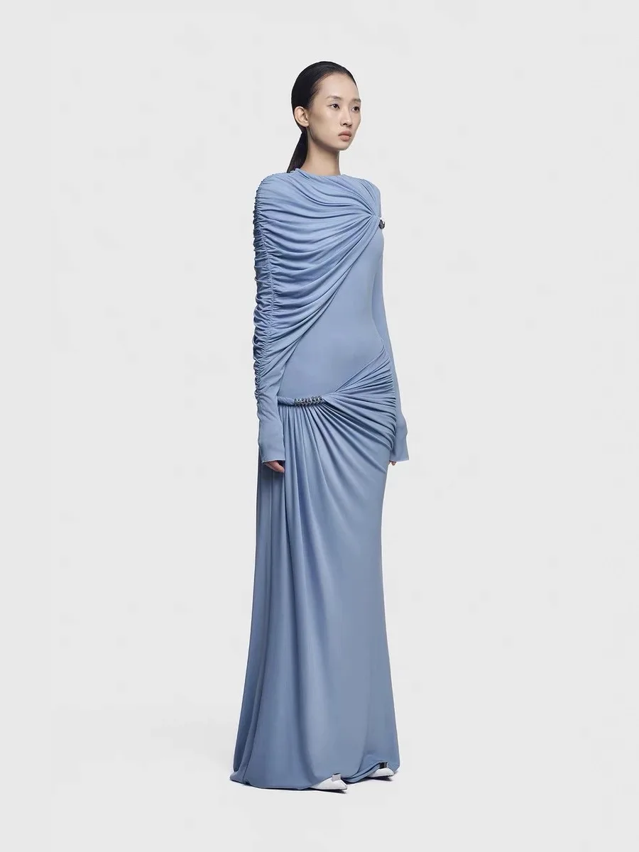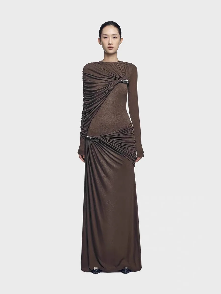 ZYHT 73907 Custom Design Long Sleeve High Neck Fashion Pleated Crystal Beads Ruched Knot High Slit Sexy Luxury Evening Dress