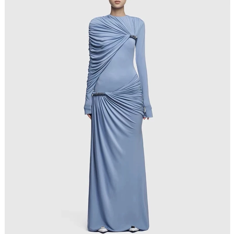 ZYHT 73902 Dark Green Blue Long Sleeve Simple Elegant Evening Dress Customize High End Women Clothing Manufacturer