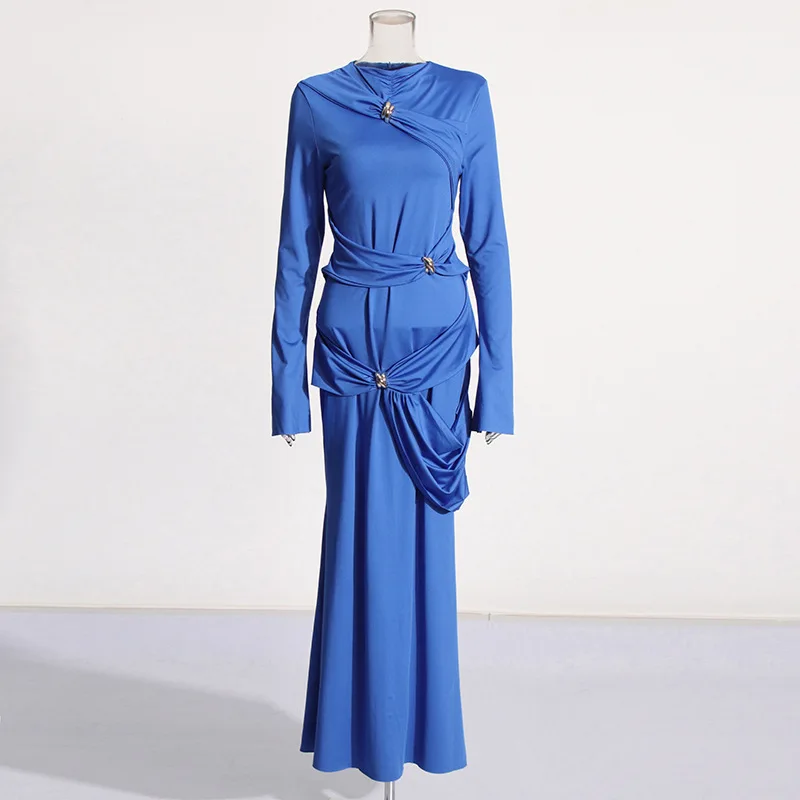 ZYHT 73907 Custom Design Long Sleeve High Neck Fashion Pleated Crystal Beads Ruched Knot High Slit Sexy Luxury Evening Dress