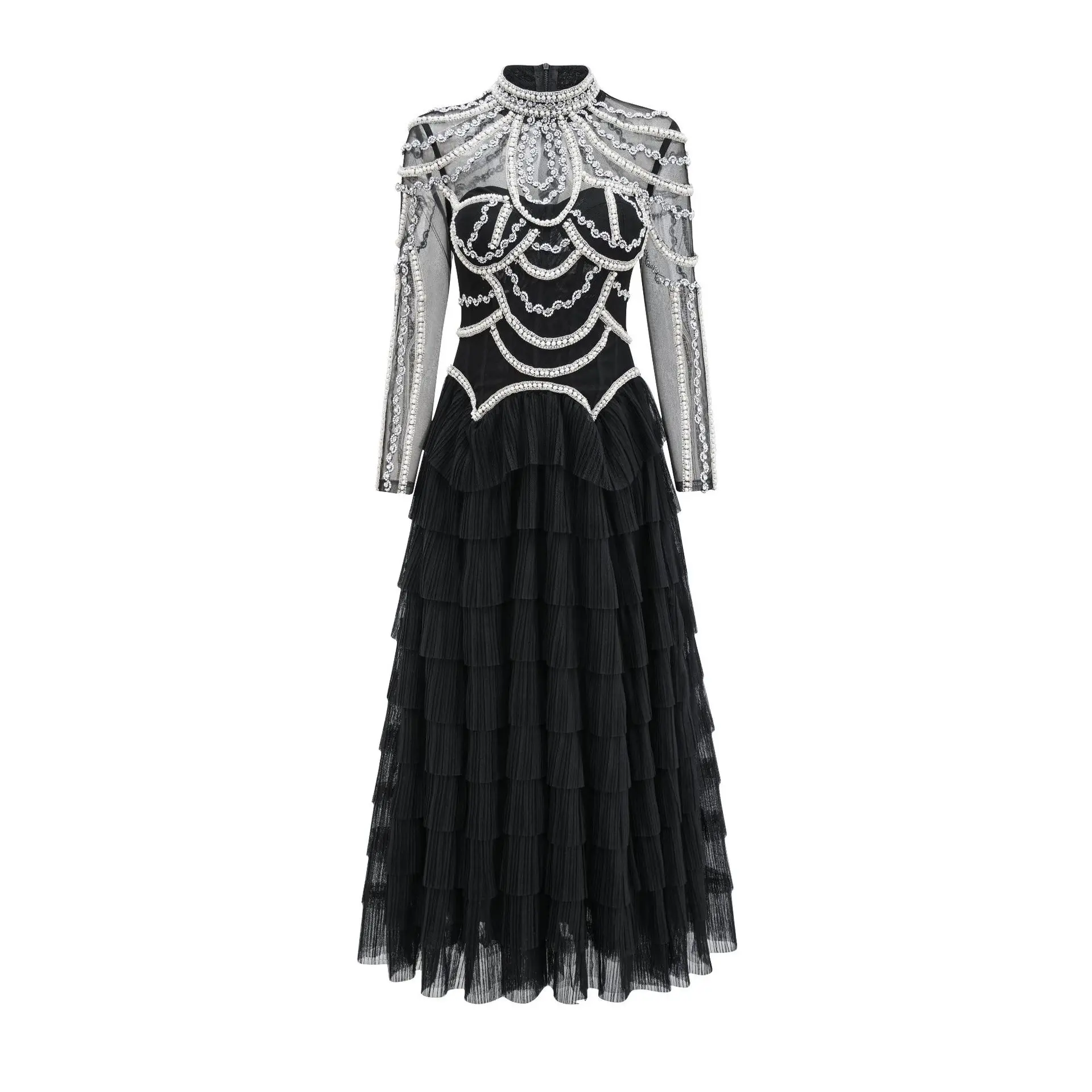 ZYHT 73907 Custom Design Long Sleeve High Neck Fashion Pleated Crystal Beads Ruched Knot High Slit Sexy Luxury Evening Dress