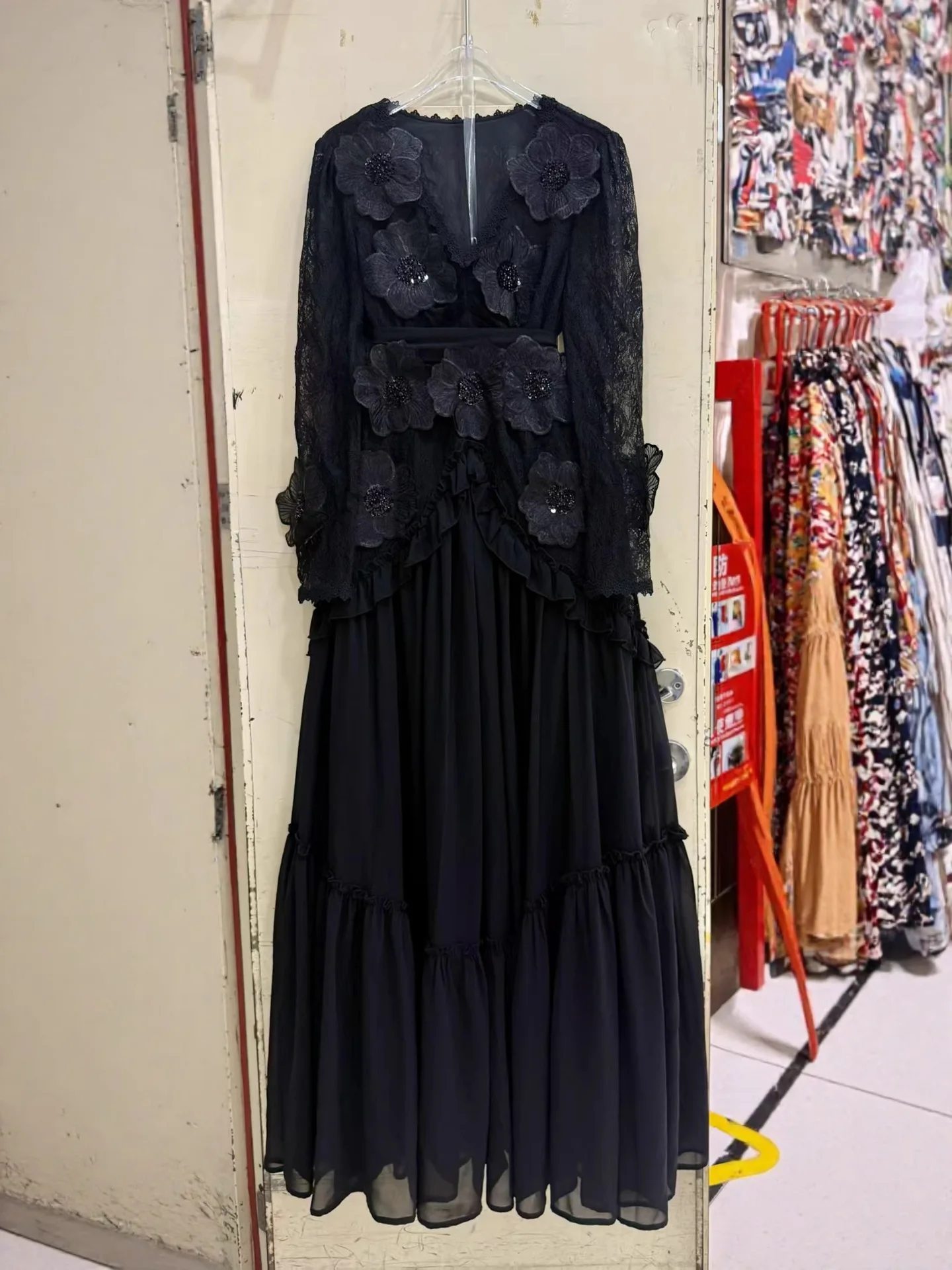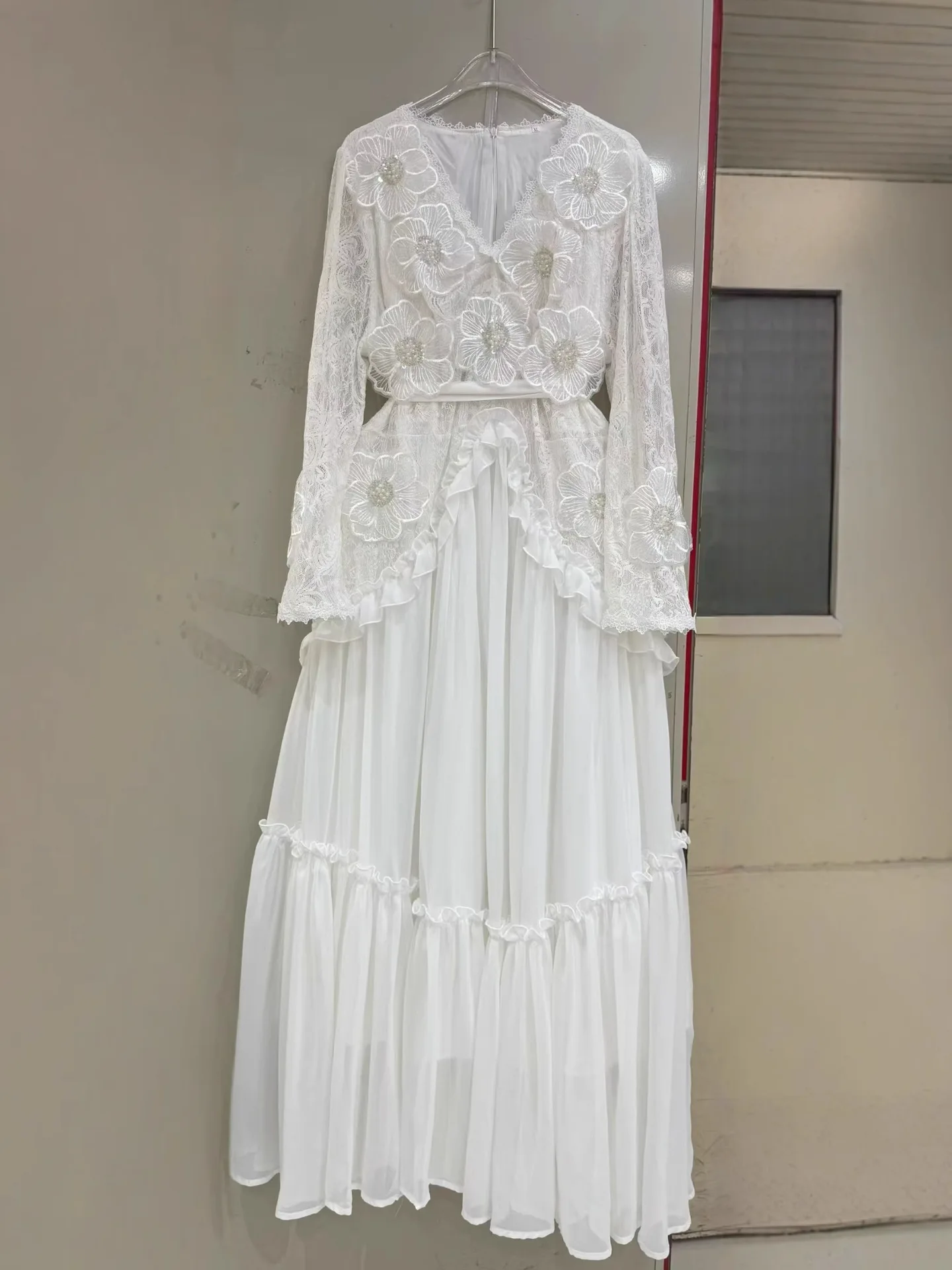 AELESEEN Autumn Winter New V-neck Retro Dress Lace 3D Appliques Floral Embroidery Midi Beaded Embroidered Flower Party Belt