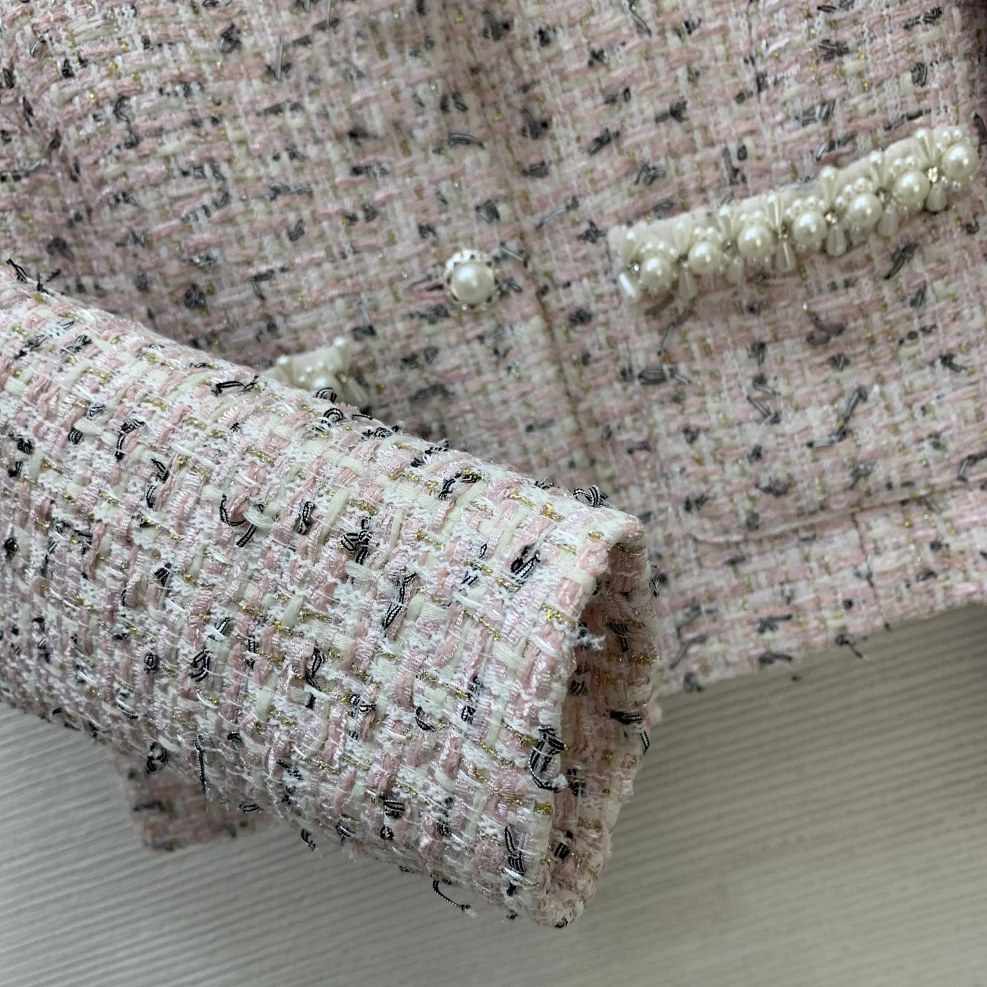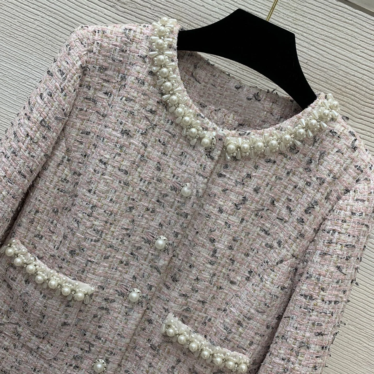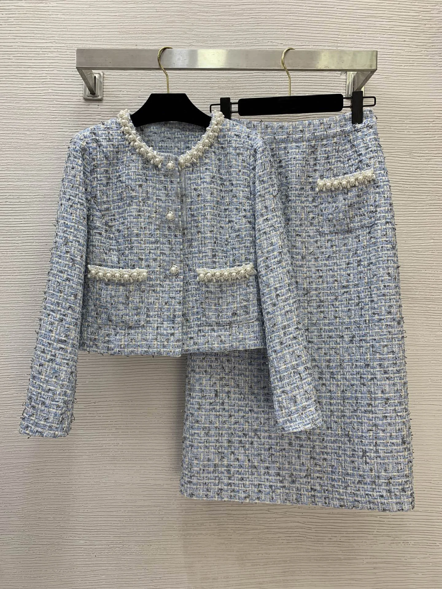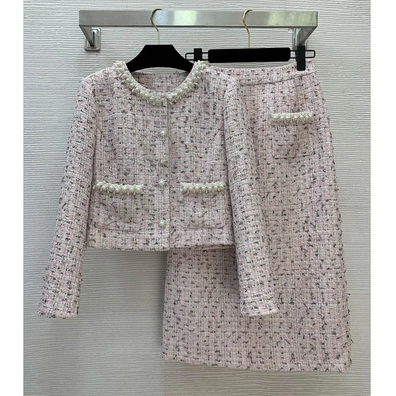 AELESEEN Designer Fashion Tweed Set Women Autumn Winter Temperament Slimming Beading Pearls Coat + Midi Skirt Two-piece Set