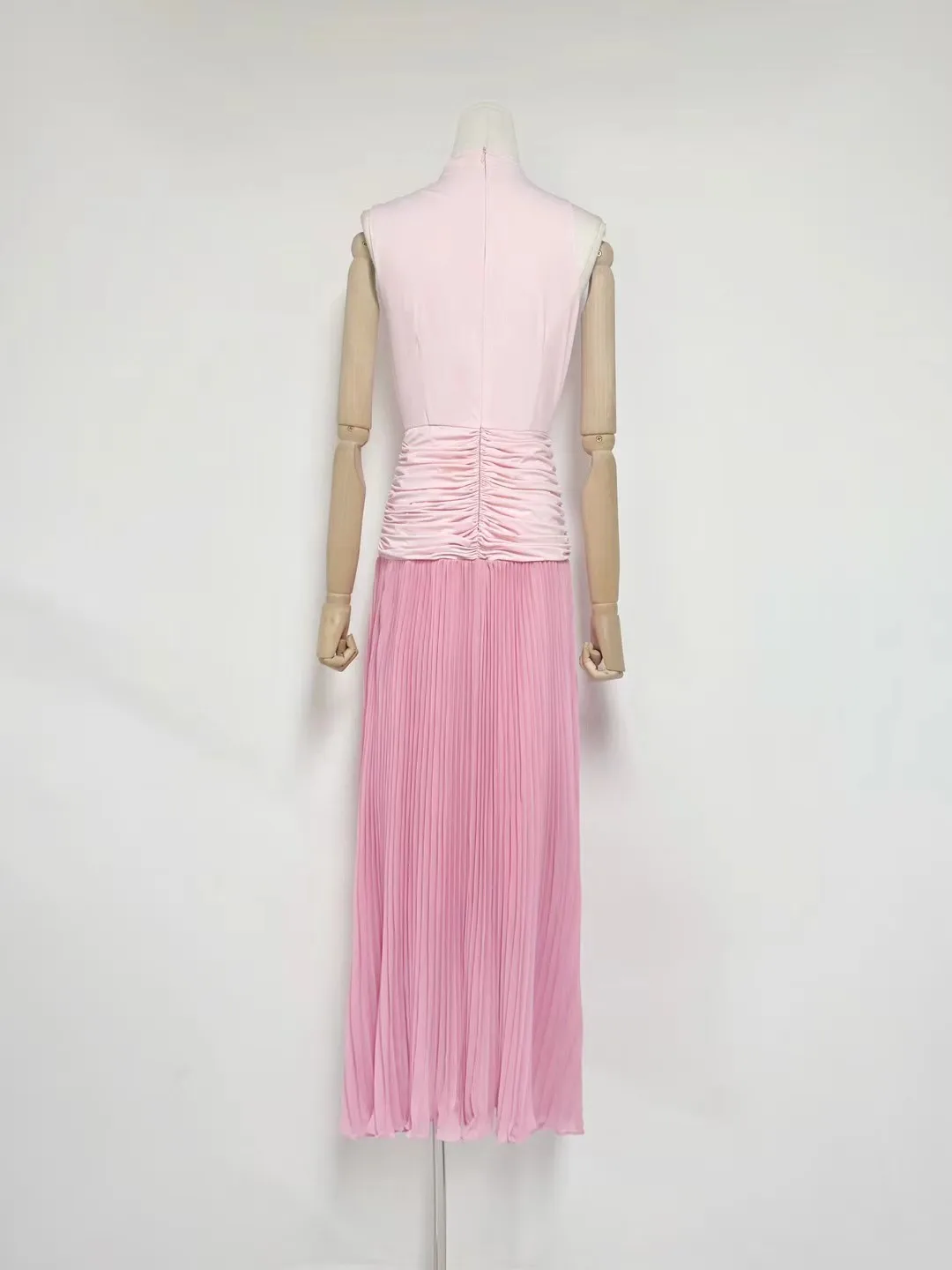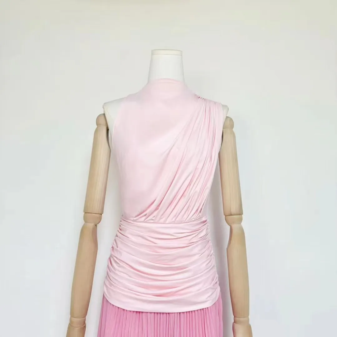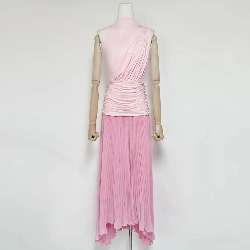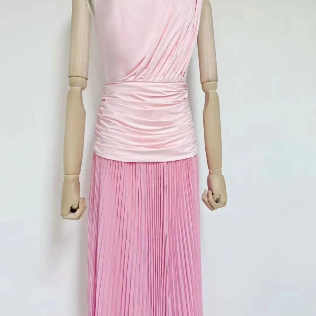 Factory Wholesale Designer Fashion Long Dress Women Spring Summer Pink Sleeveless Pleated Draped Socialite Parties Office