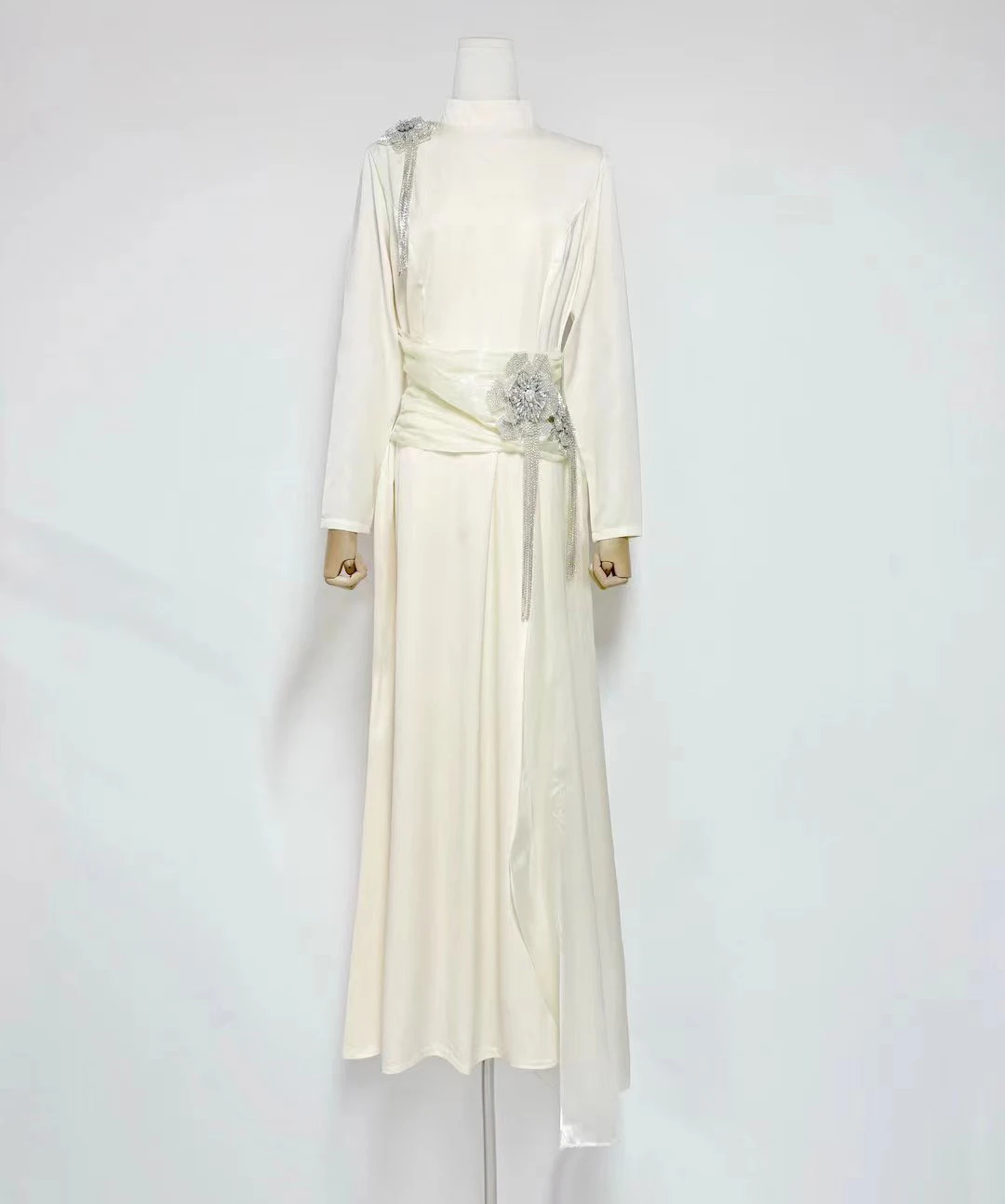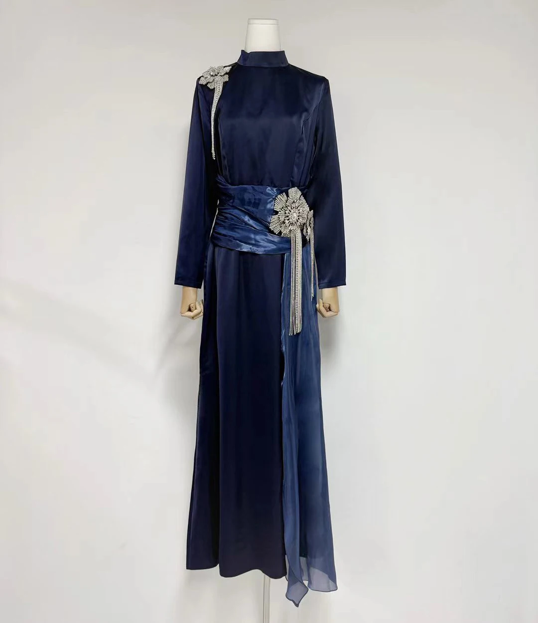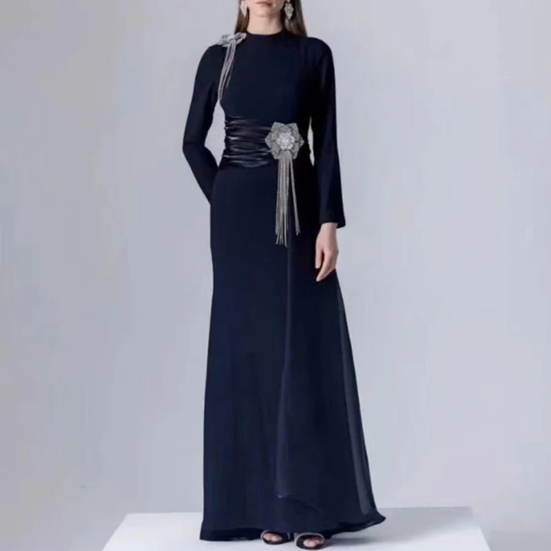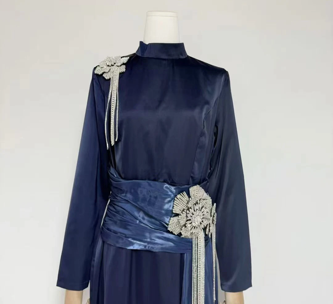 Factory Wholesale Designer Fashion Long Dress Women Autumn Winter Stand Long Sleeve Draped Diamonds Socialite Parties Office