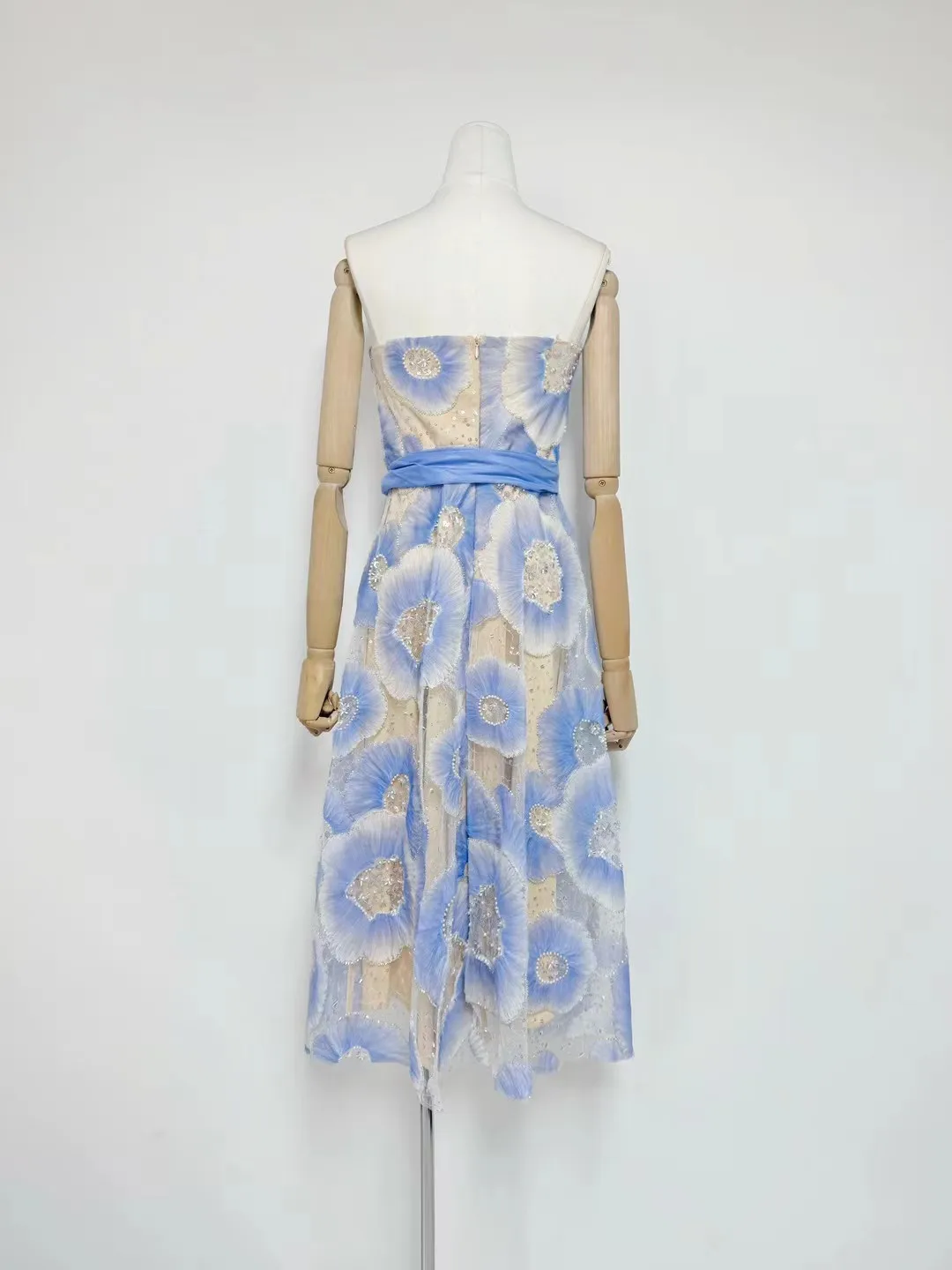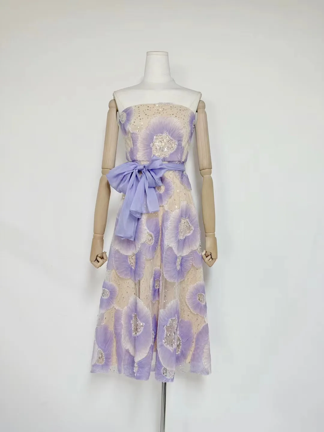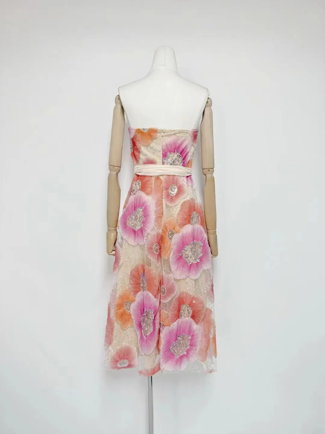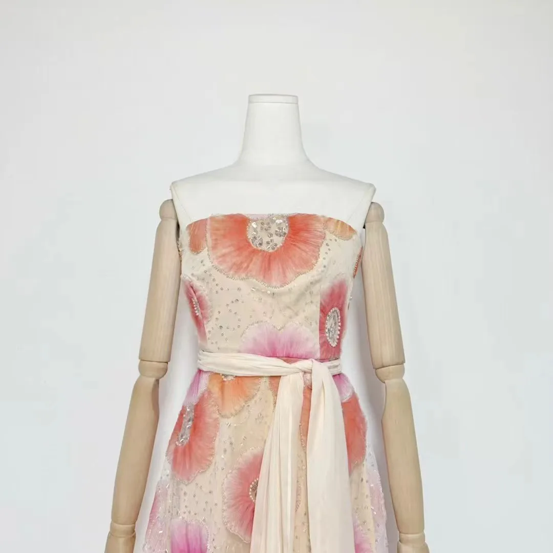 Factory Wholesale Runway Fashion Party Dress Women Spring Summer Strapless 3D Appliques Flower Elegant Midi Embroidery Female