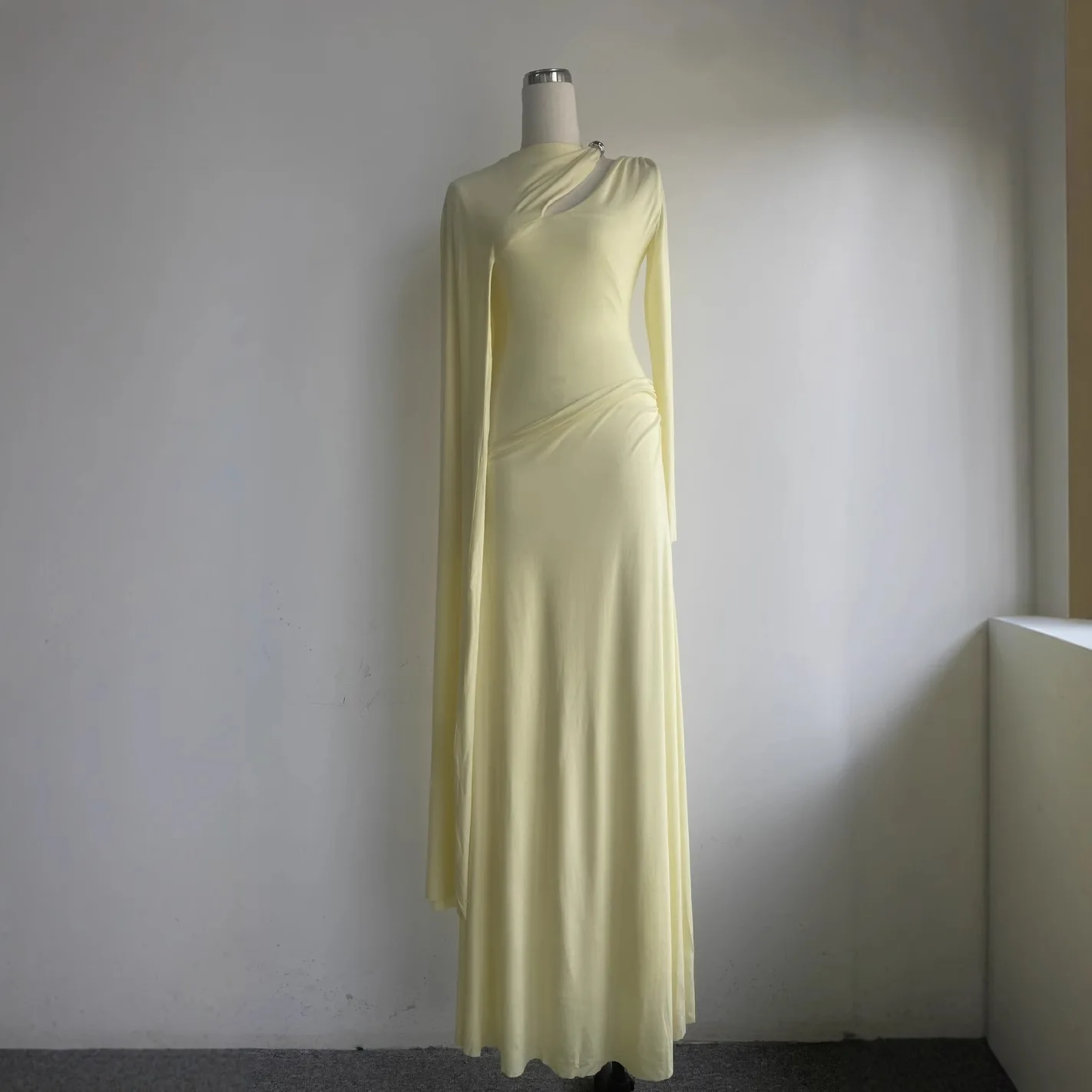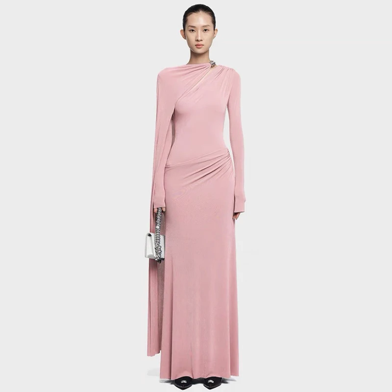 AELESEEN Designer Fashion Maxi Dress Solid Color Slim Fit Asymmetrical Pleats Metal Buckle Floor-Length Natural In-Stock