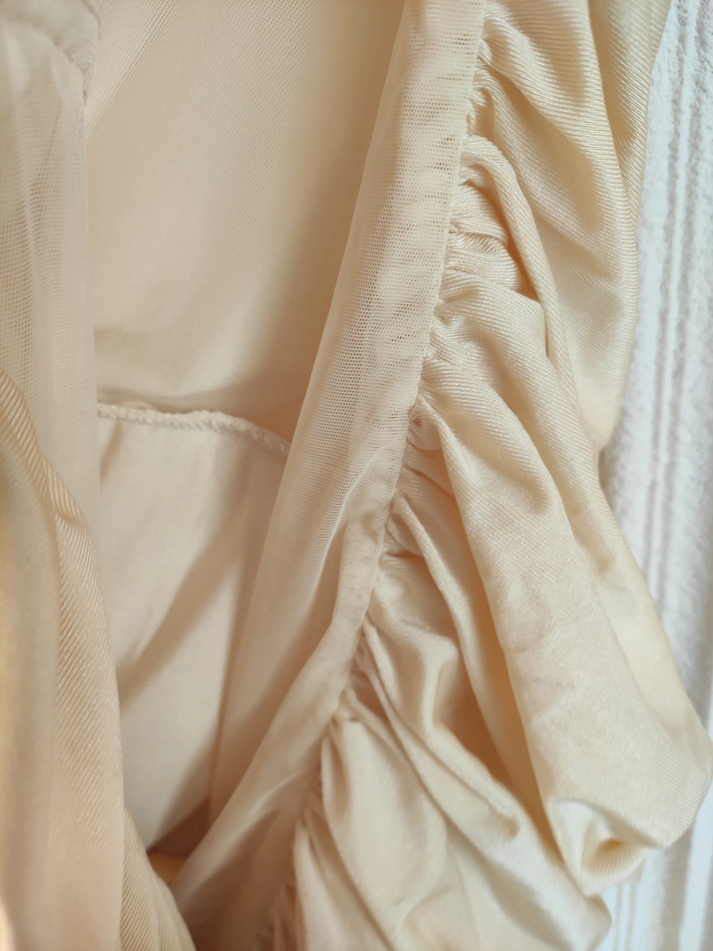 ZYHT 82053 Apricot Lace Top with Tiered Ruffled Sleeves V-Neck & Gold Buttons Blouse Wanita Elegan Women Blouse