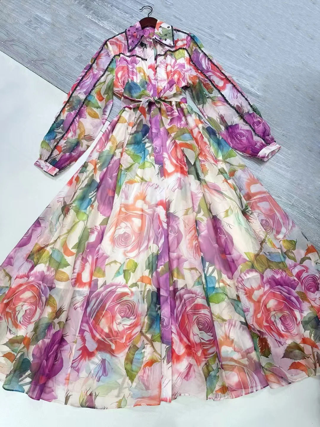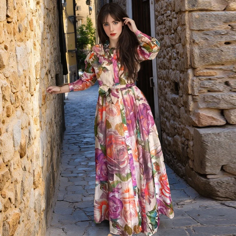 AELESEEN Sicilian Party Dress Women Spring Summer Full Sleeve Lace Beading Turn-down Collar Natural Waist A-line Floral Print