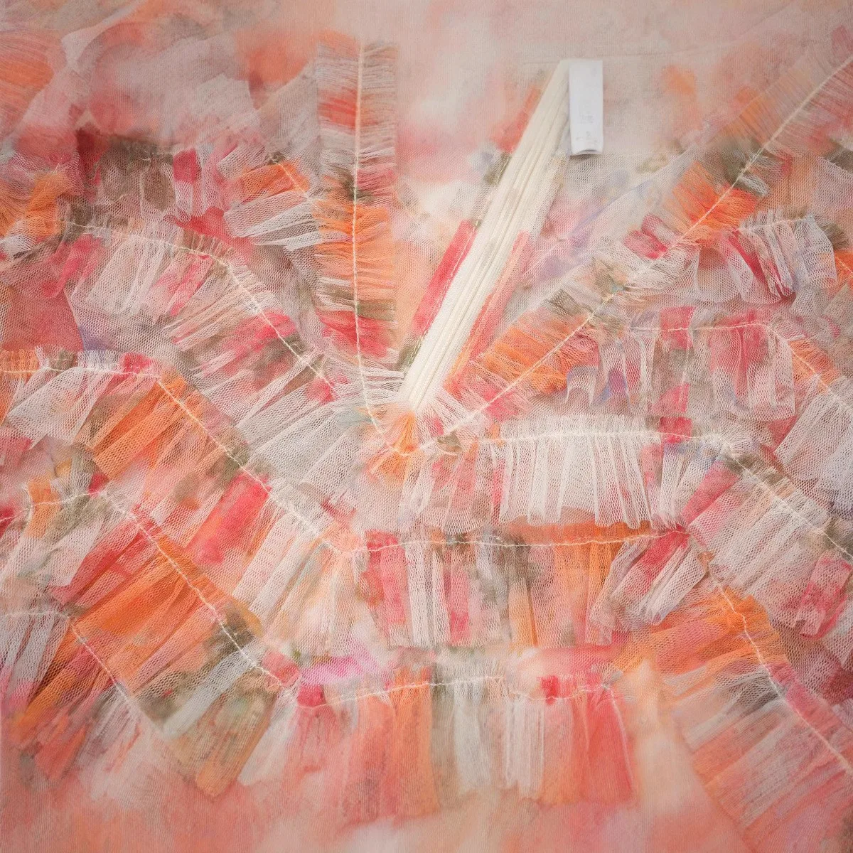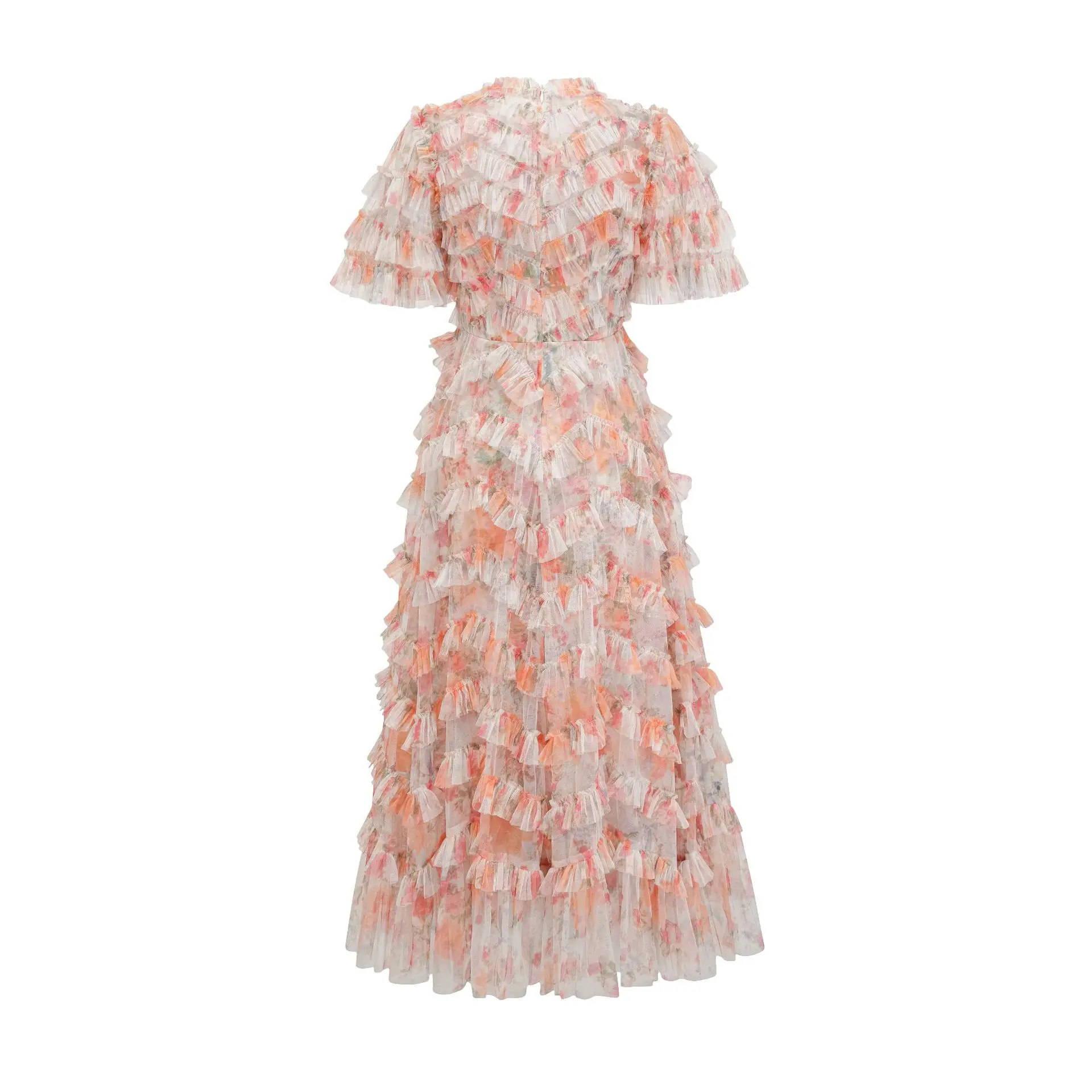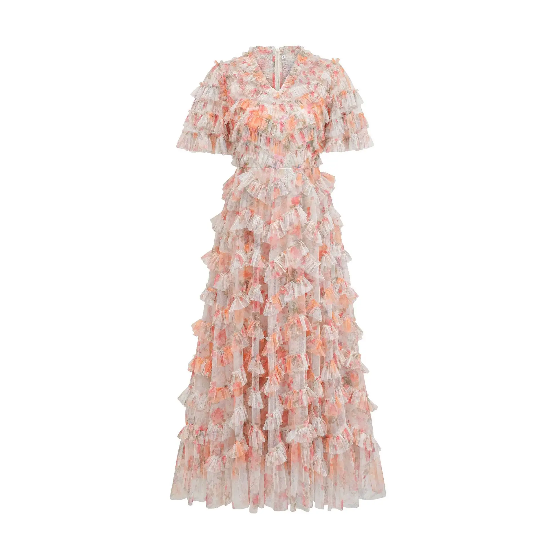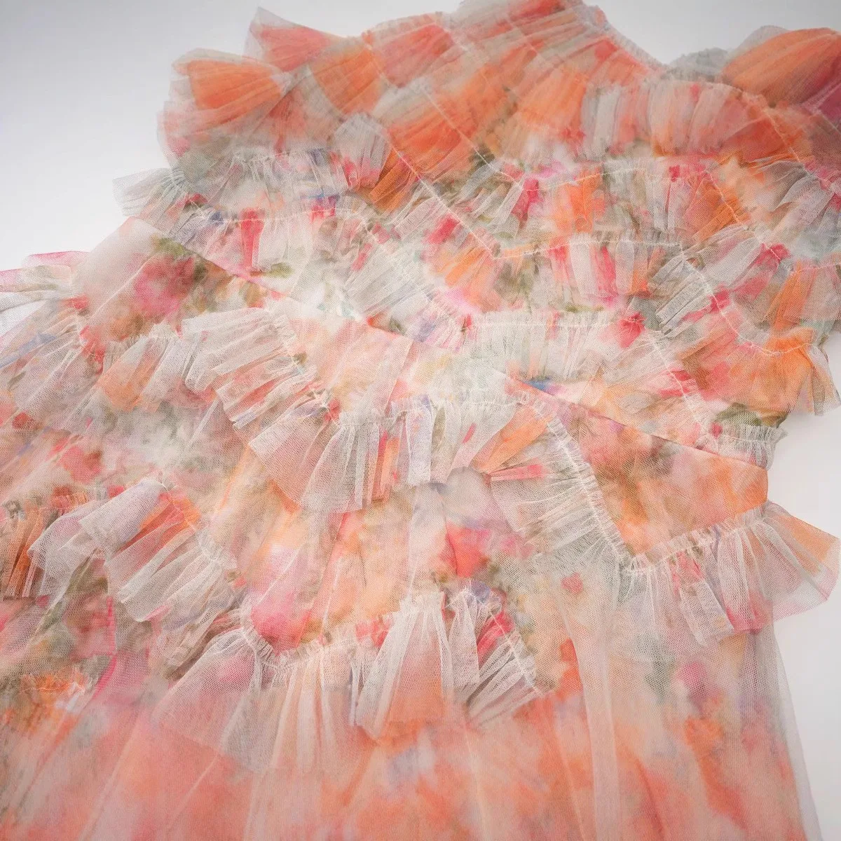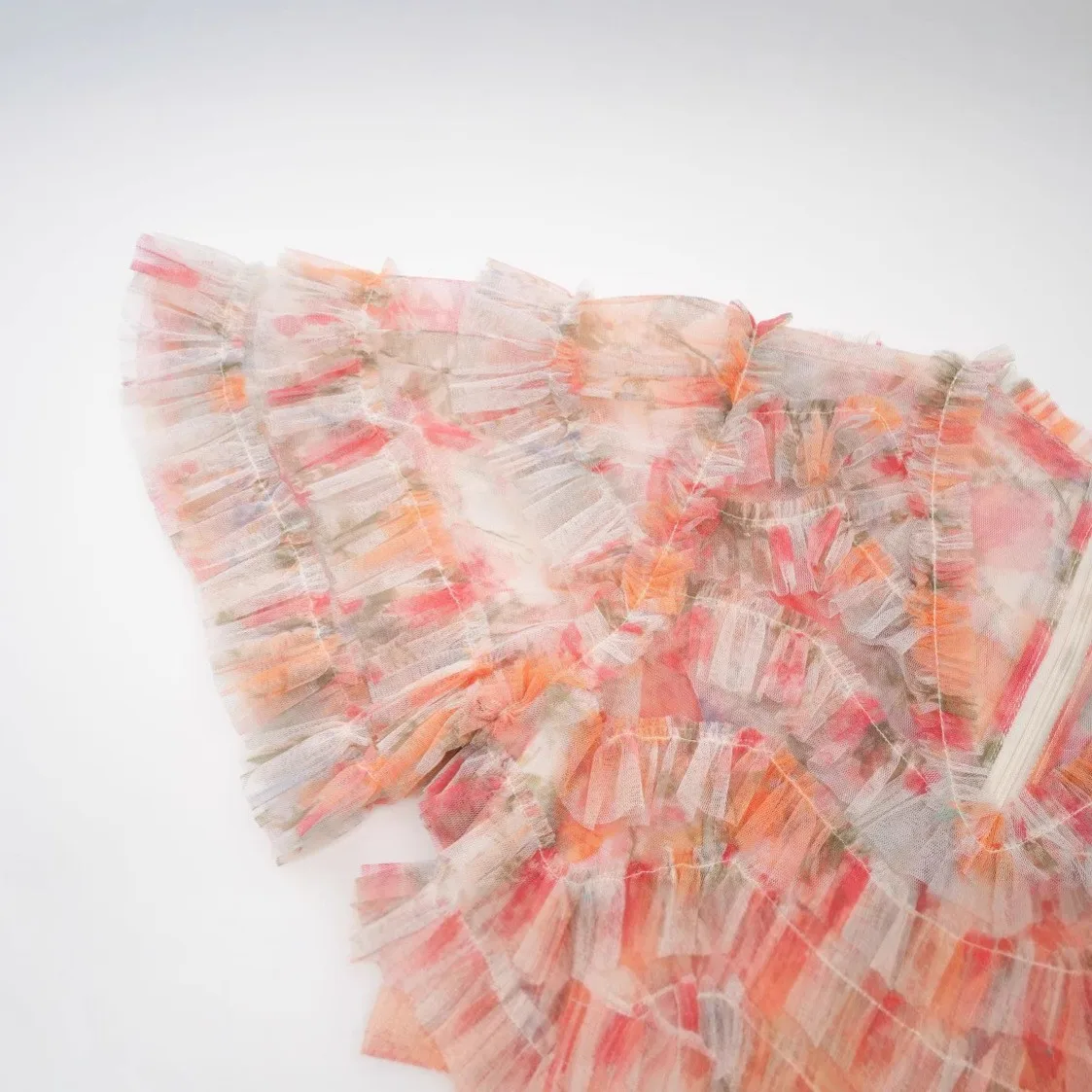 Runway Fashion Summer Dress for Women Flare Short Sleeve V-Neck Floral Printed Edible Tree Fungus Ruffles Mesh 3D Tulle Prom