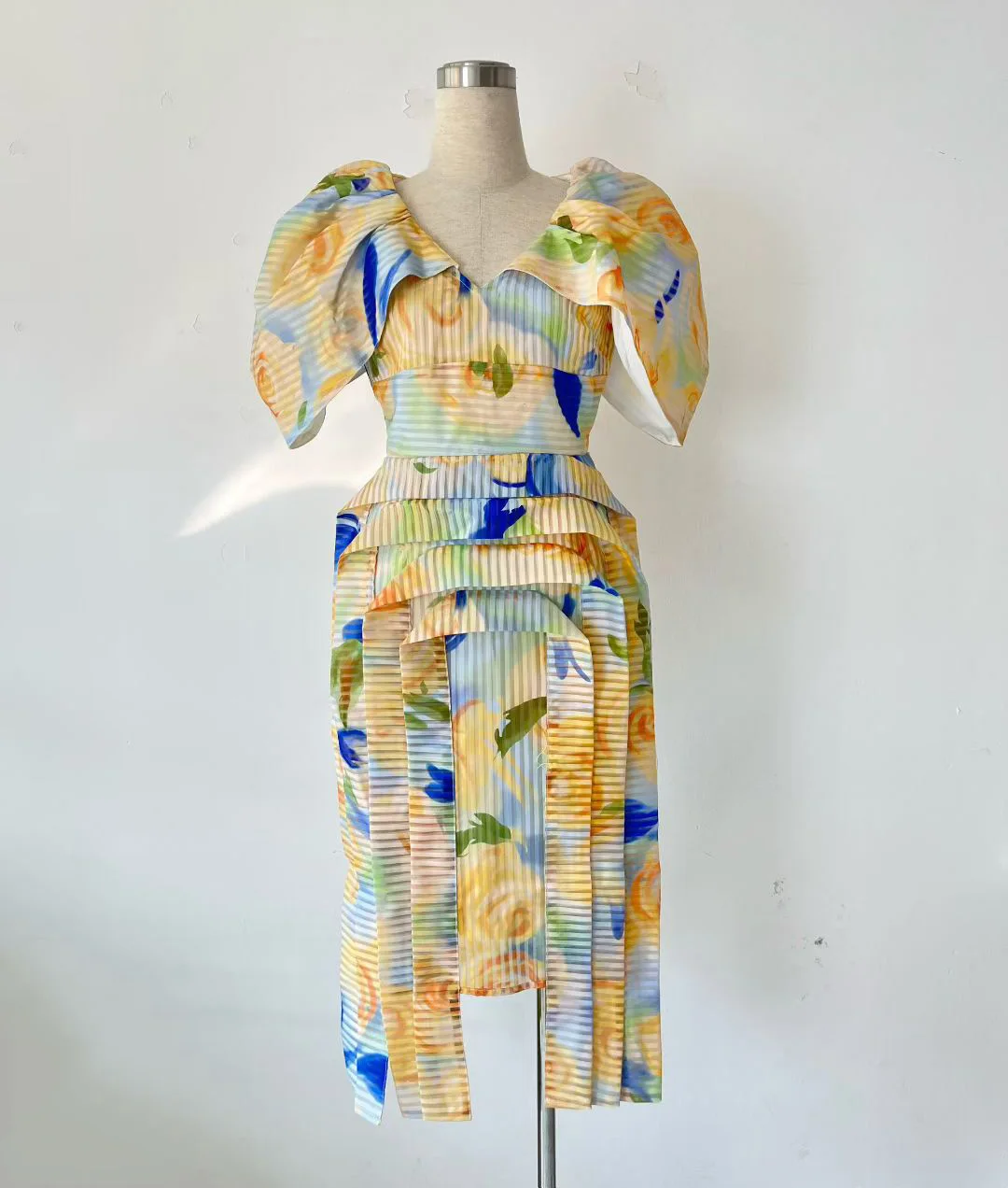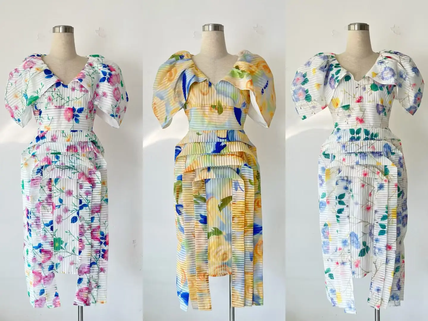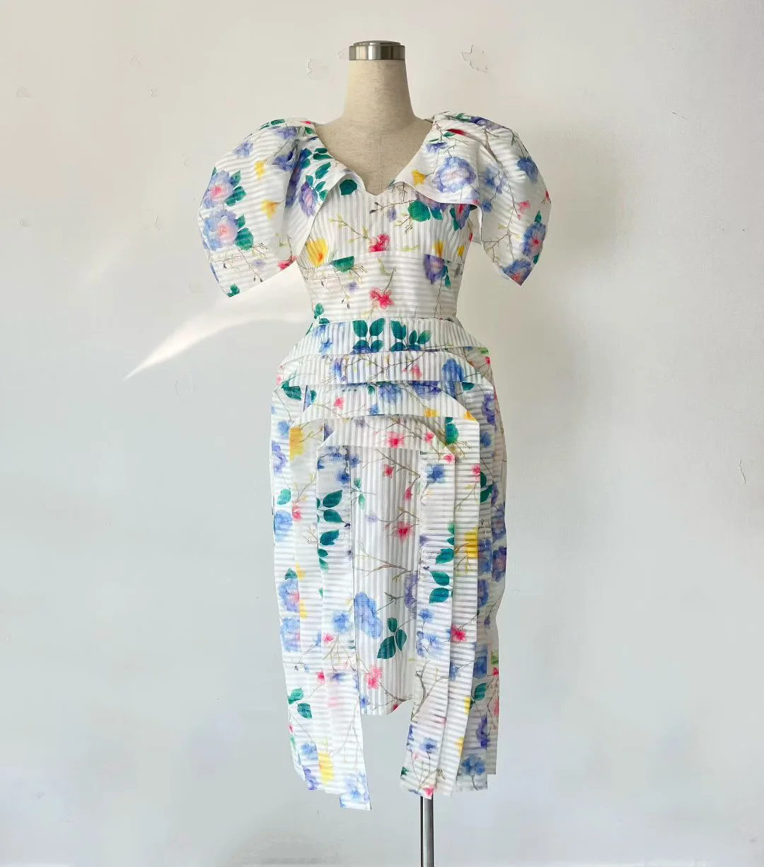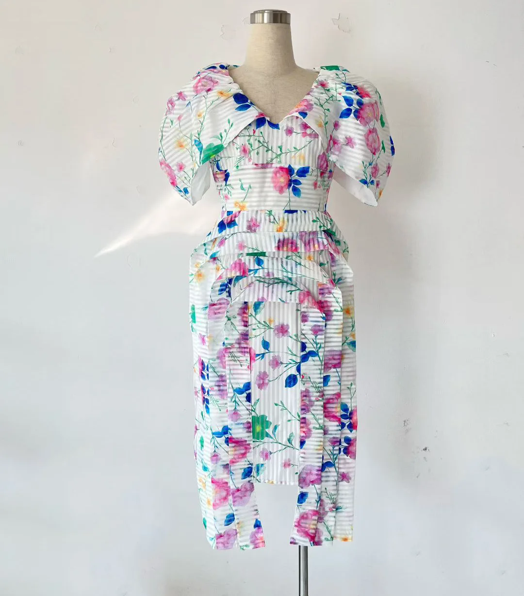 Factory Wholesale Runway Fashion Midi Dress Women Summer Cap Sleeve V-Neck Floral Printed Pleated Slim Elegant Party Female