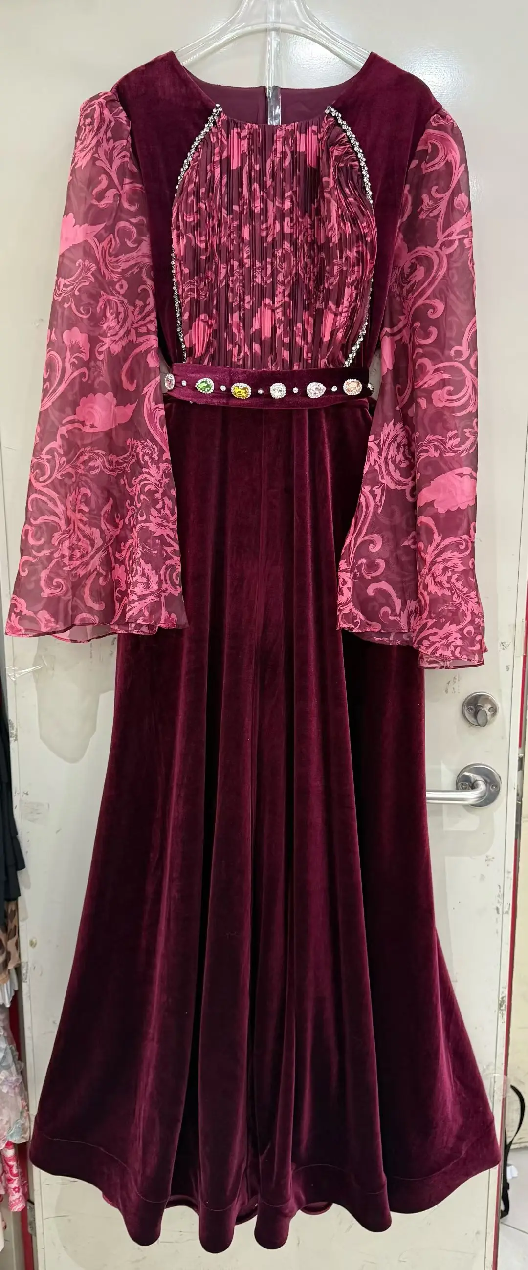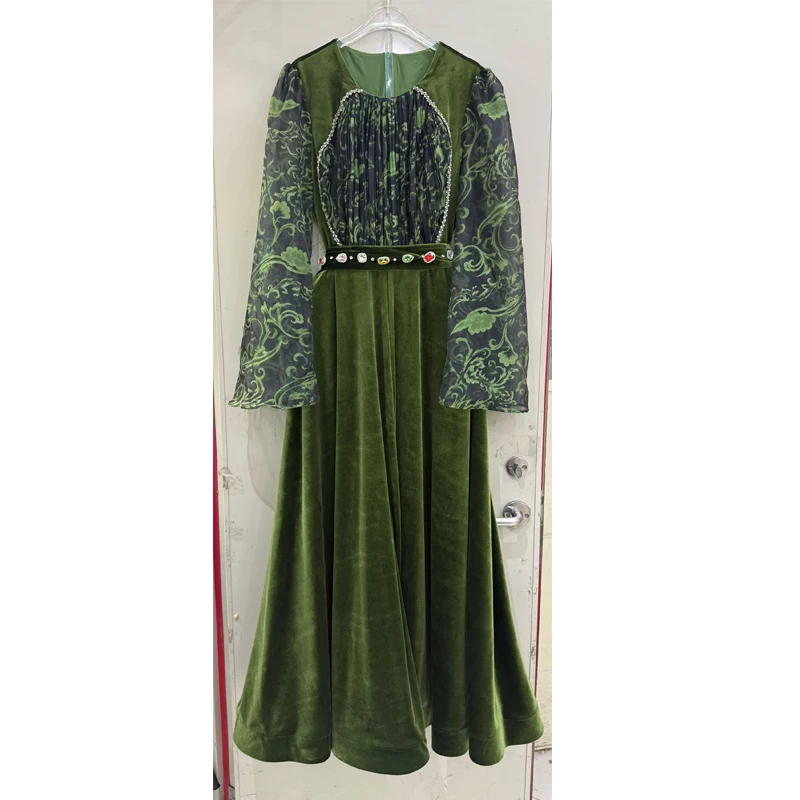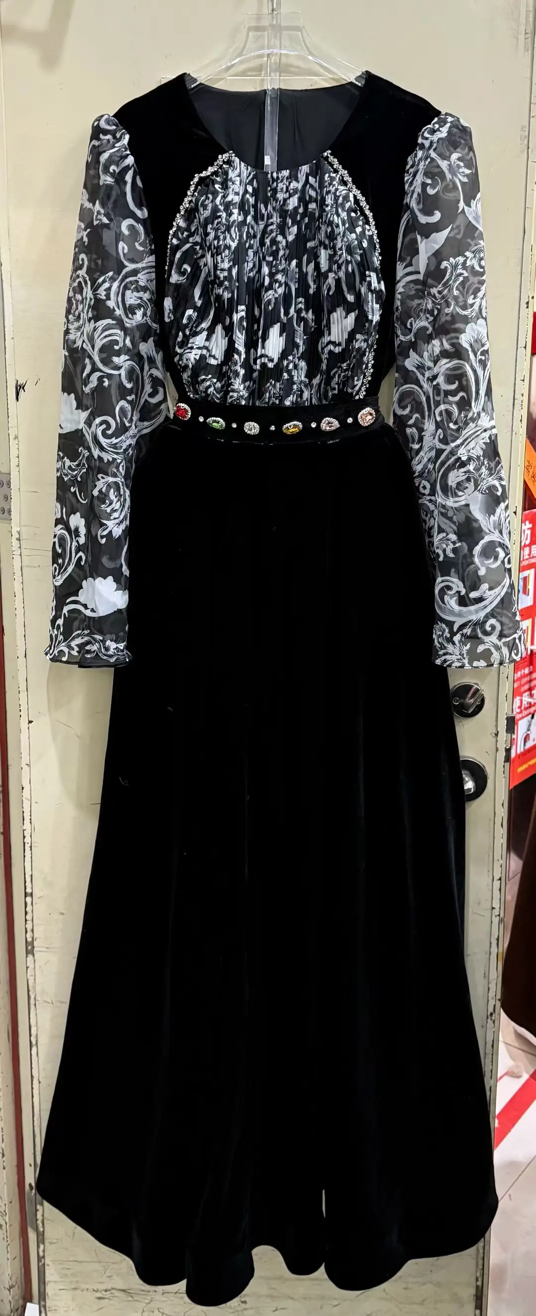 AELESEEN Own Factory Autumn Winter Dress Women New Velvet Flower Printed Crystal Diamonds Vintage Loose Midi Casual Dress