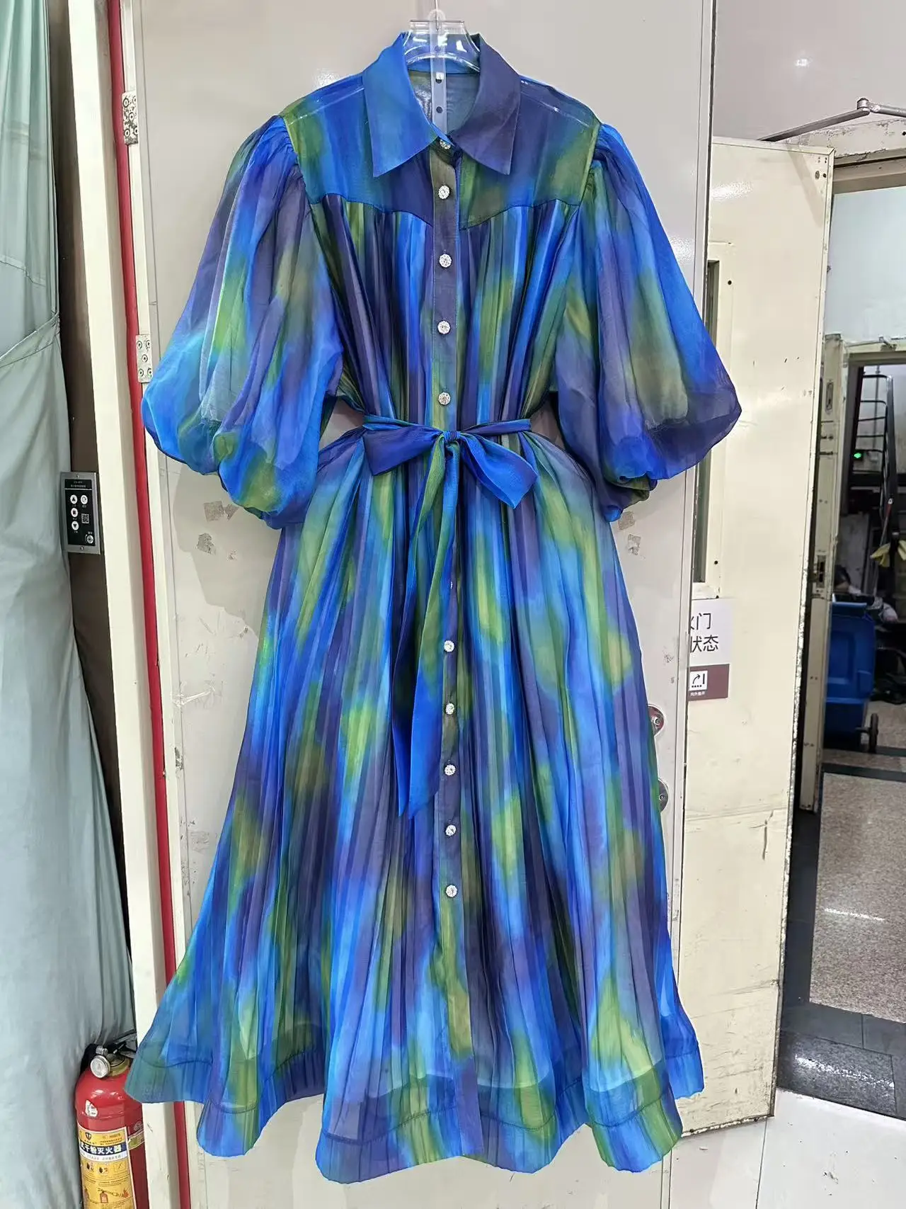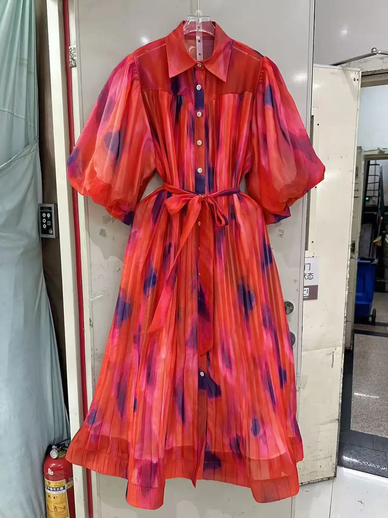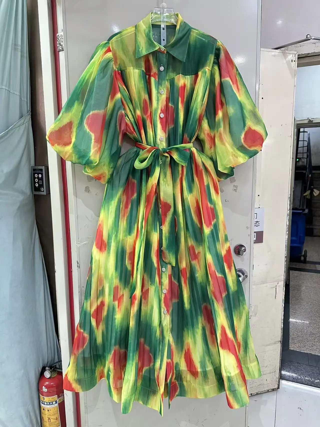 Vintage High-end Spring Summer New Fashion Loose Dress Women Design Mesh Puff Sleeve Printed Belt Casual Midi Party Dress