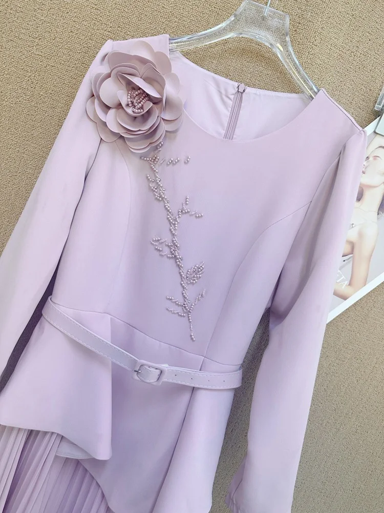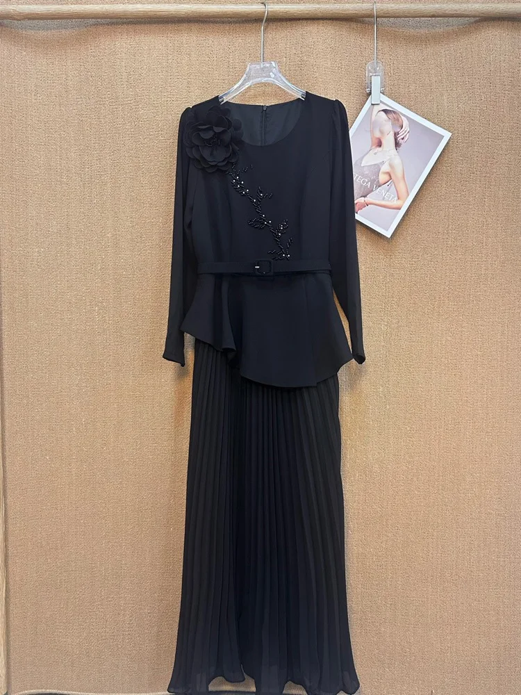 Factory Wholesale V-neck Long Sleeve Diamond Floor-length A-line Natural Waist Fashion 3D Appliques Dress Women's Autumn Winter