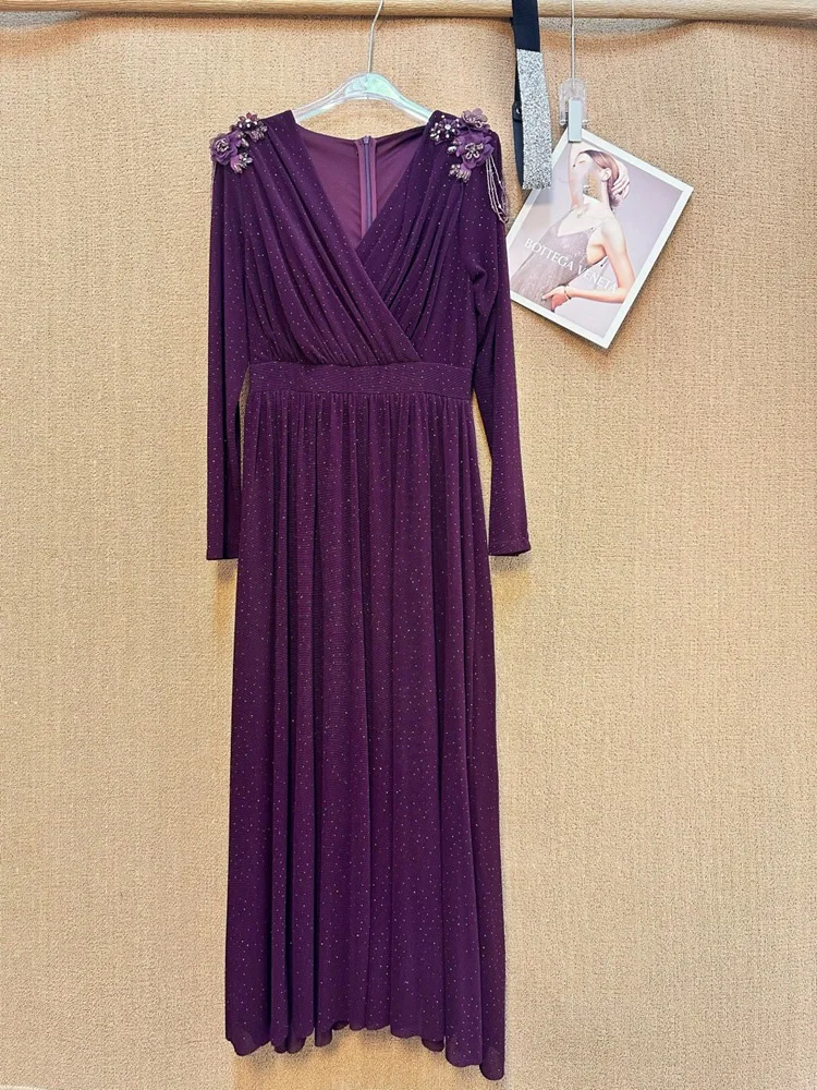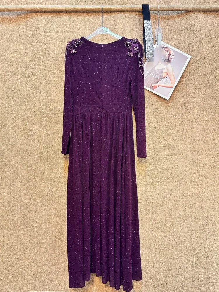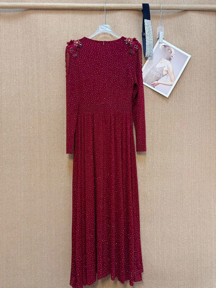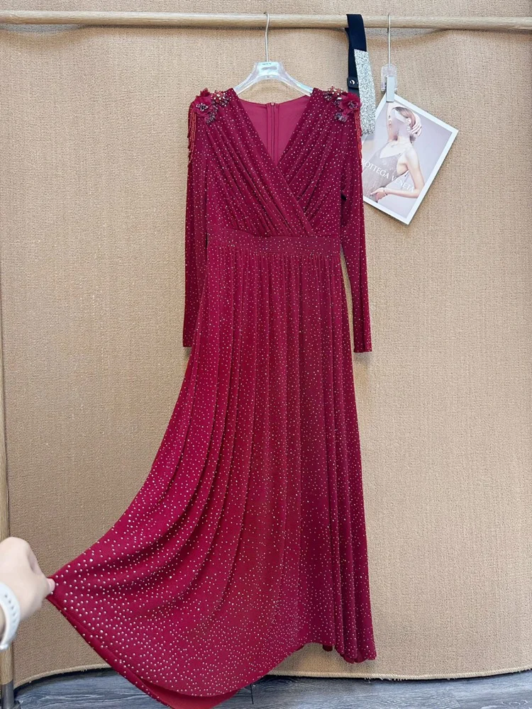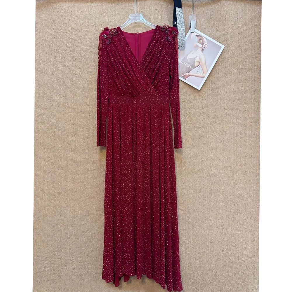 Factory Wholesale Luxury Diamond Three-dimensional Sexy Deep V-neck Polka Dot Elegant Pencil Autumn Winter Long Dress Party