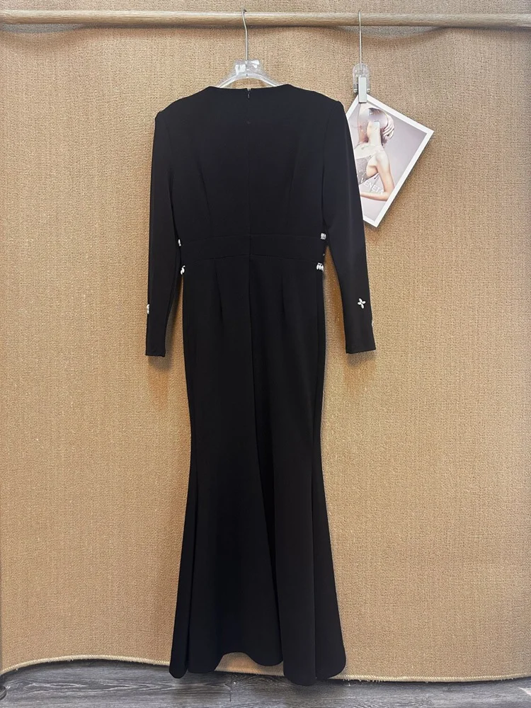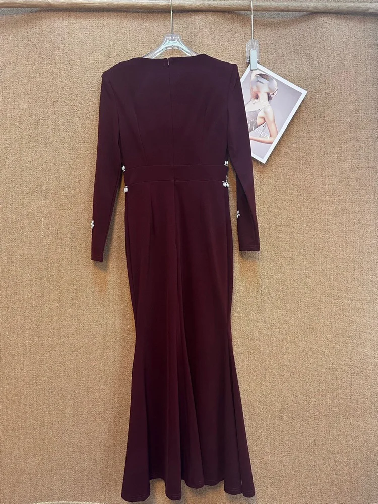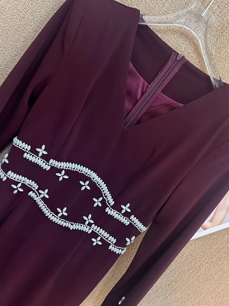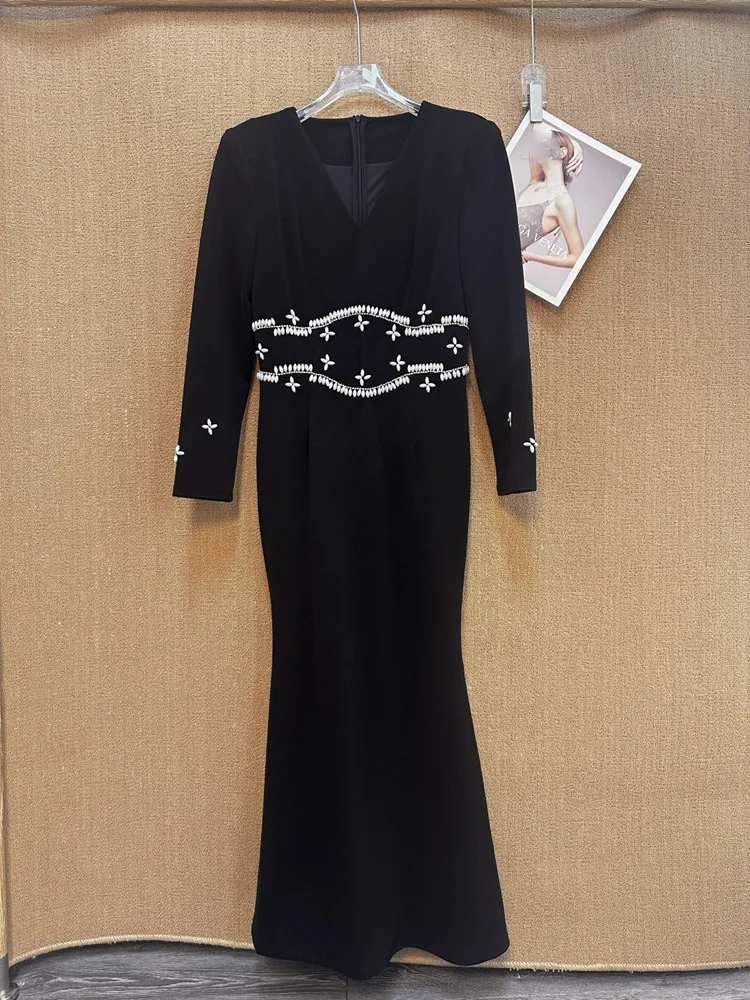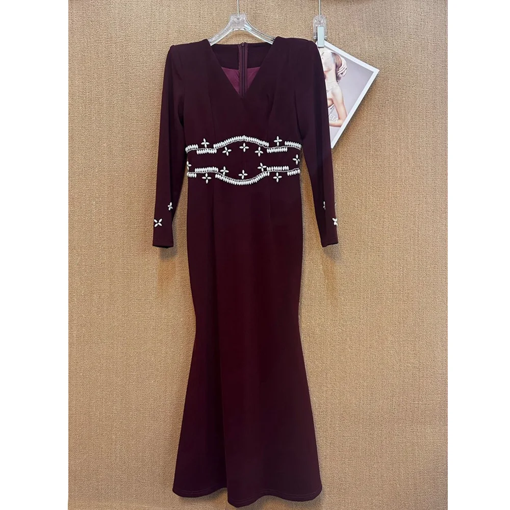 Factory Wholesale Autumn Winter Long Trumpet Dress Women Handmade Beaded Sexy Diamond V-neck Long Sleeve Banquet Elegant Party
