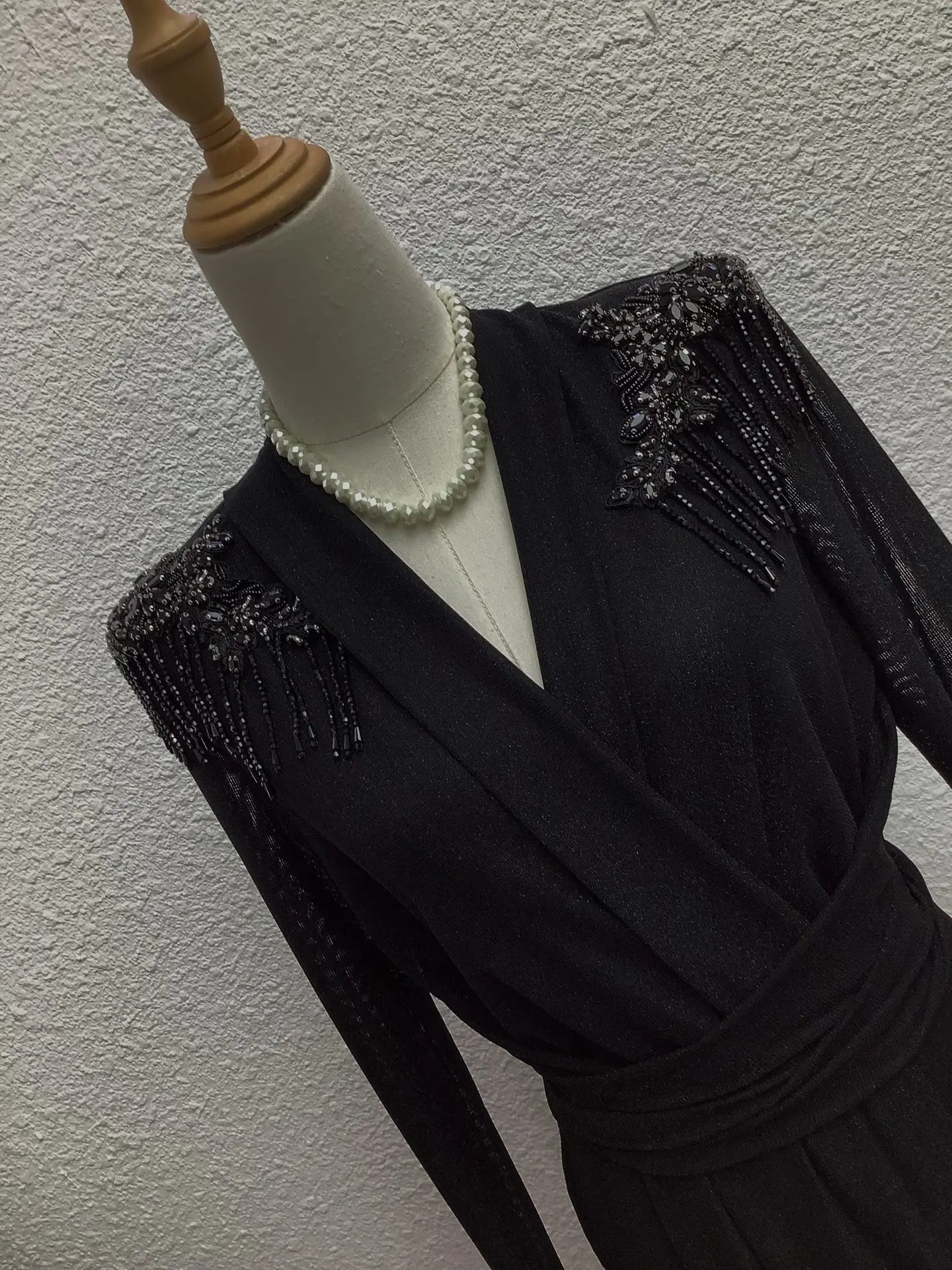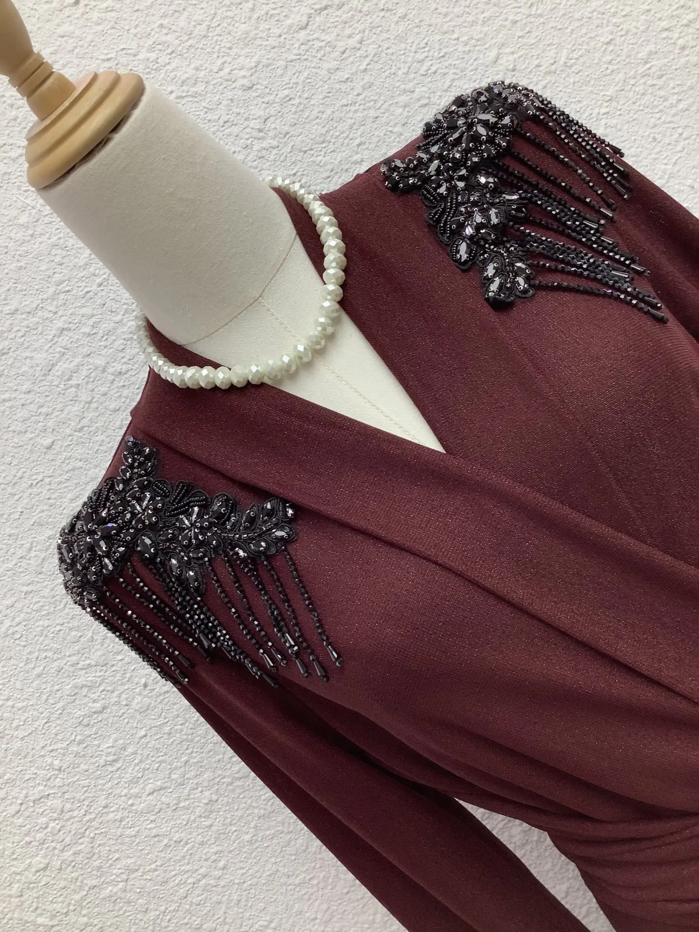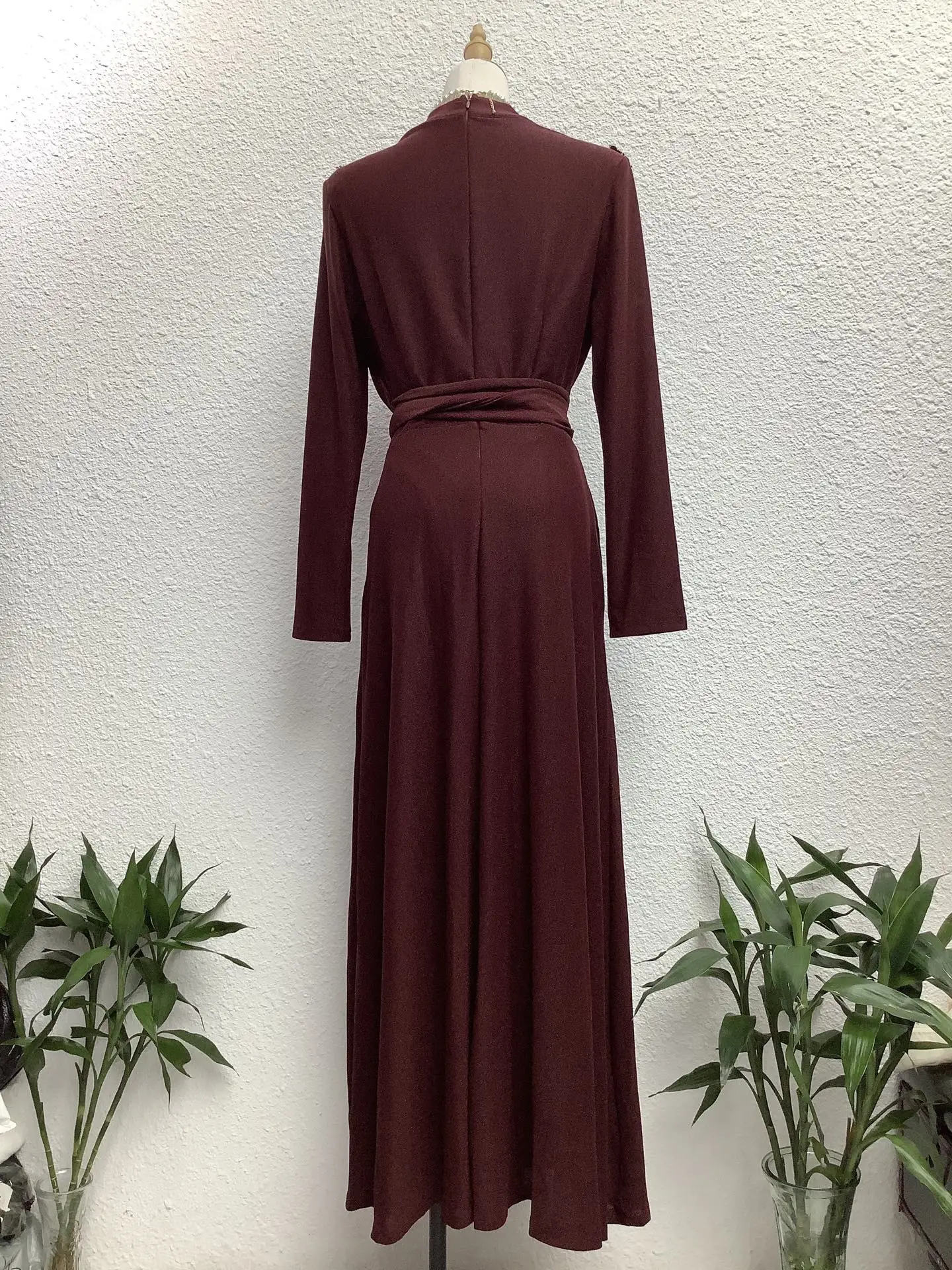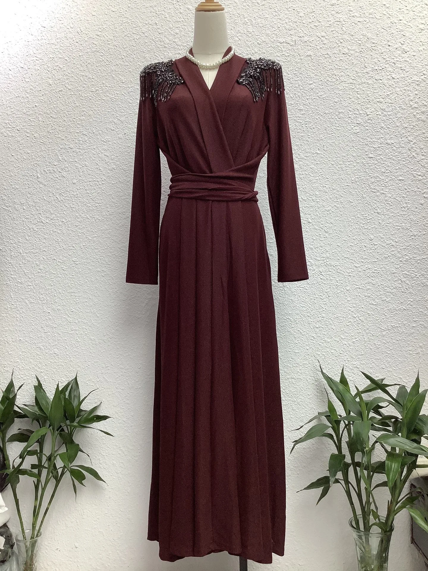 Factory Wholesale Vintage V-Neck High-Waist A-Line Dress Women Long Sleeve Beading Patchwork Mid-Length Formal Dress Elegant