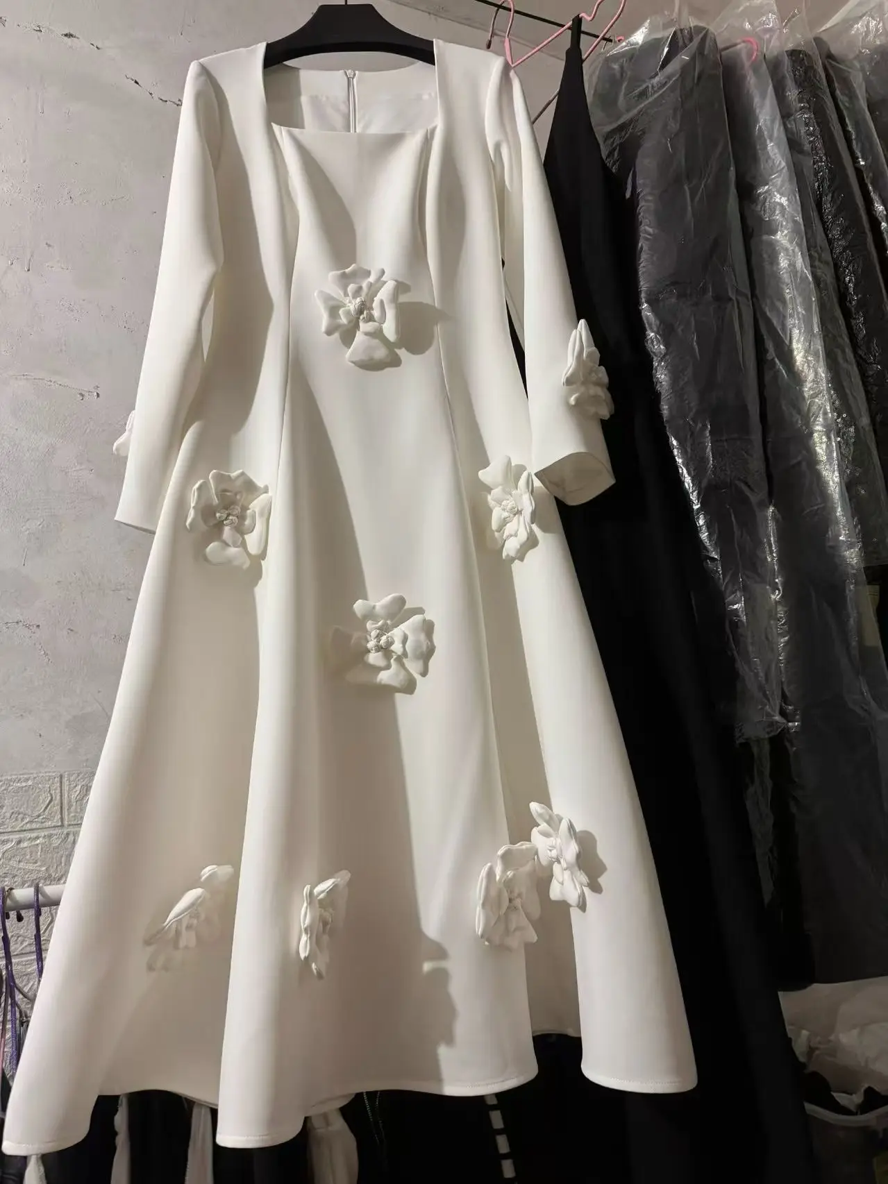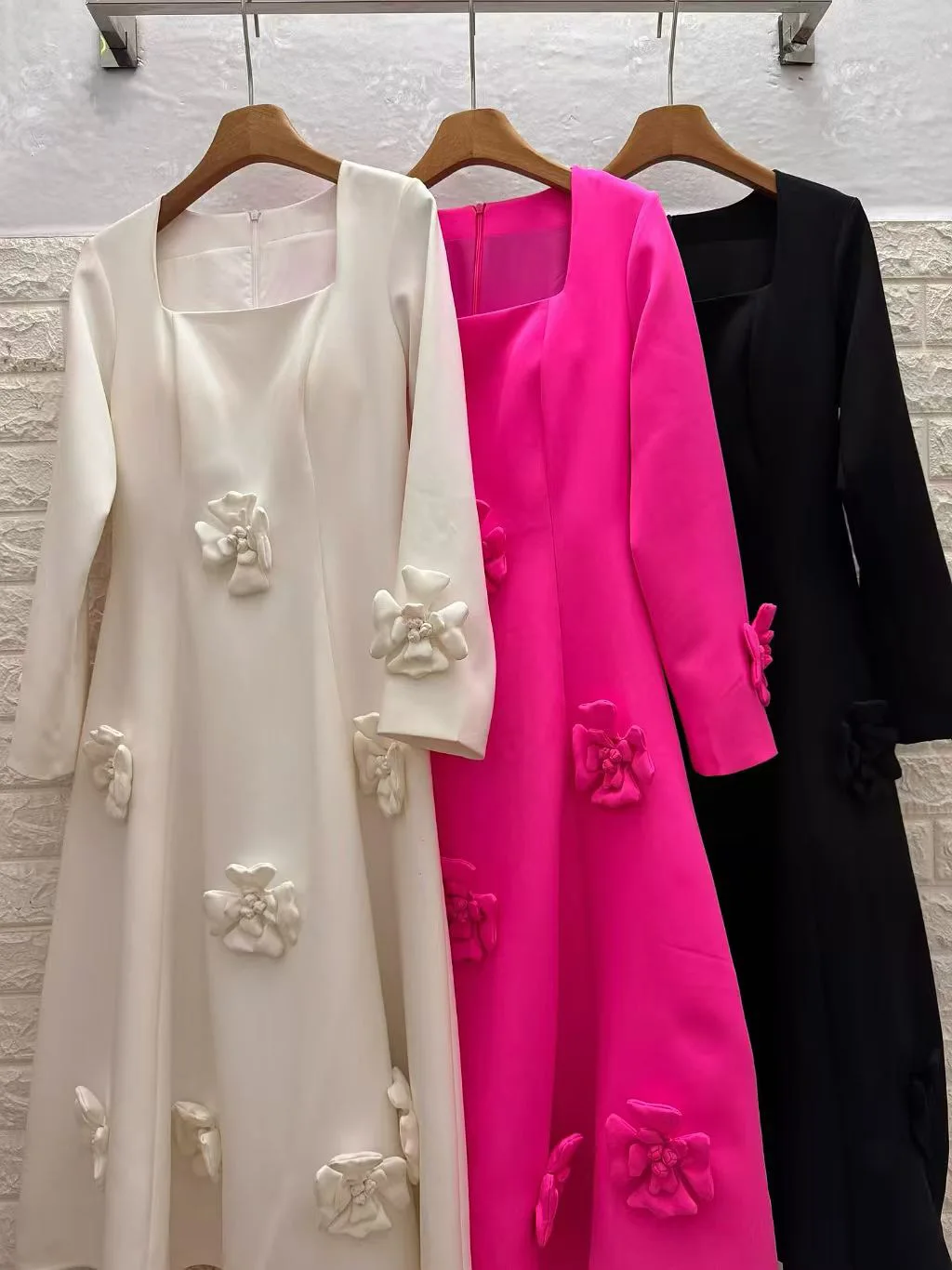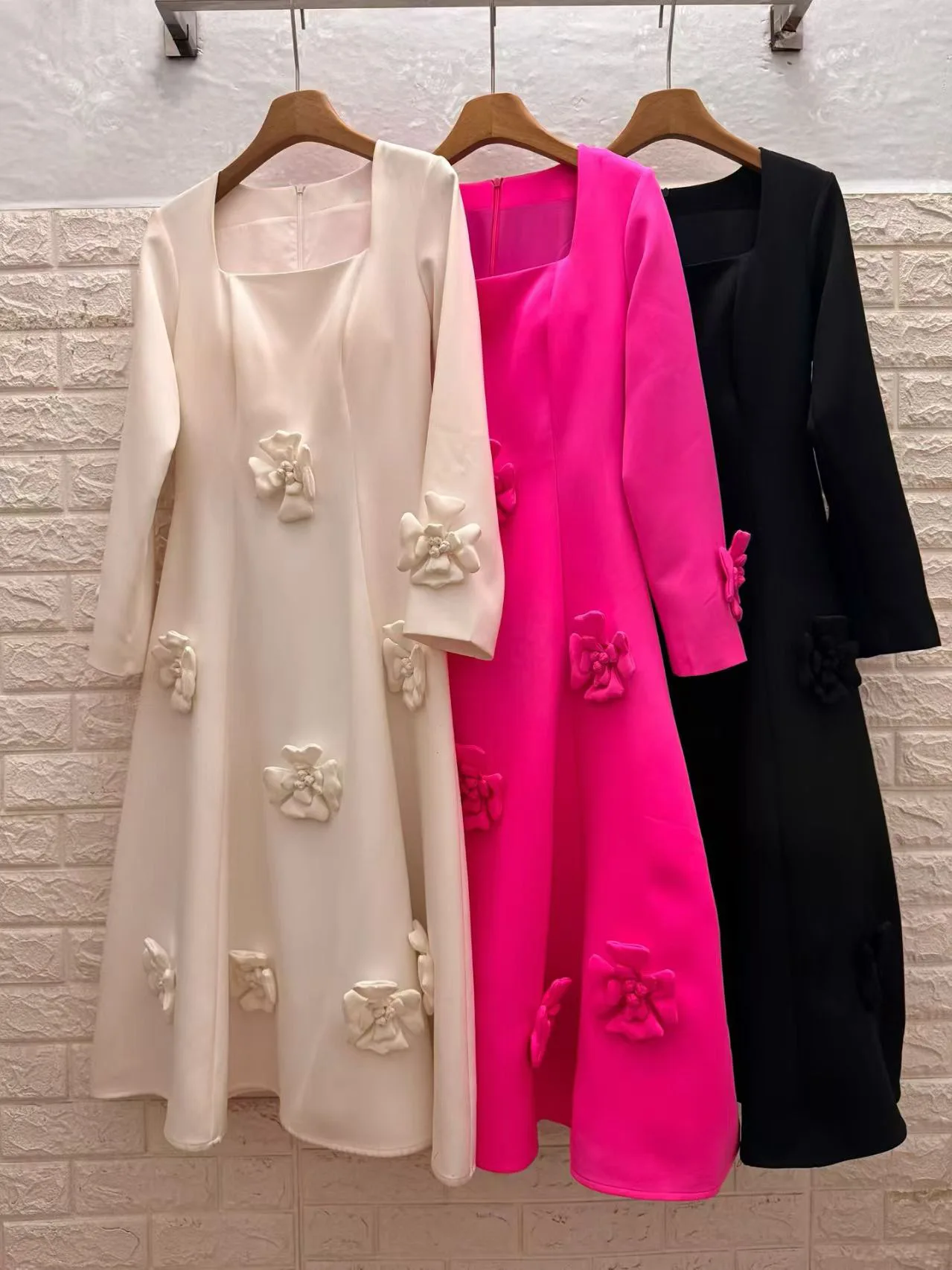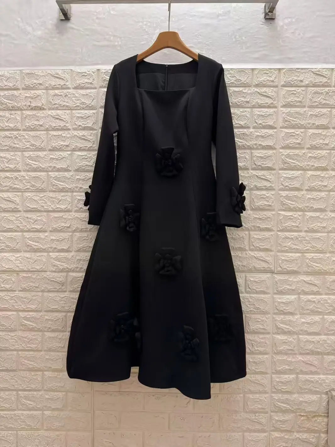 AELESEEN Spliced Appliques Elegant Dresses for Women Autumn Square Collar Long Sleeves High Waist Patchwork Zipper Midi Female
