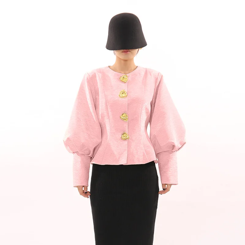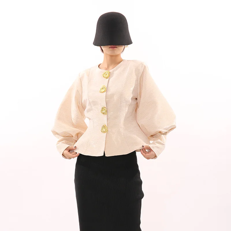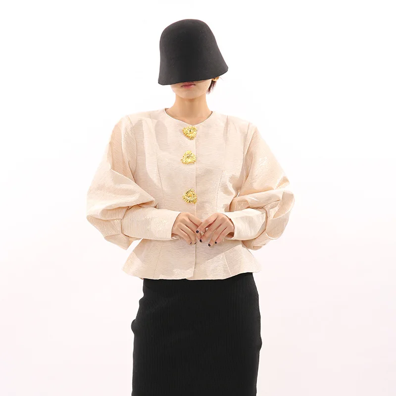 Factory Wholesale Autumn New High-End Solid Color Top Slimming Fashion Long Lantern Sleeve Matel Button Elegant Jacket Women
