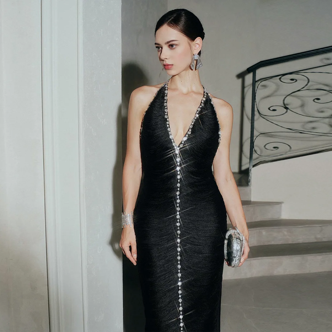 Factory Wholesale Spring Summer Midi Dress Women Halter Beading Rhinestone Tassel V-Neck Backless Luxury Sleeveless Elegant