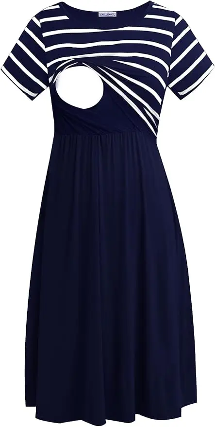 Pregnant Women Can Wear This Short-sleeved Patchwork Maternity Nursing Dress for Breastfeeding.