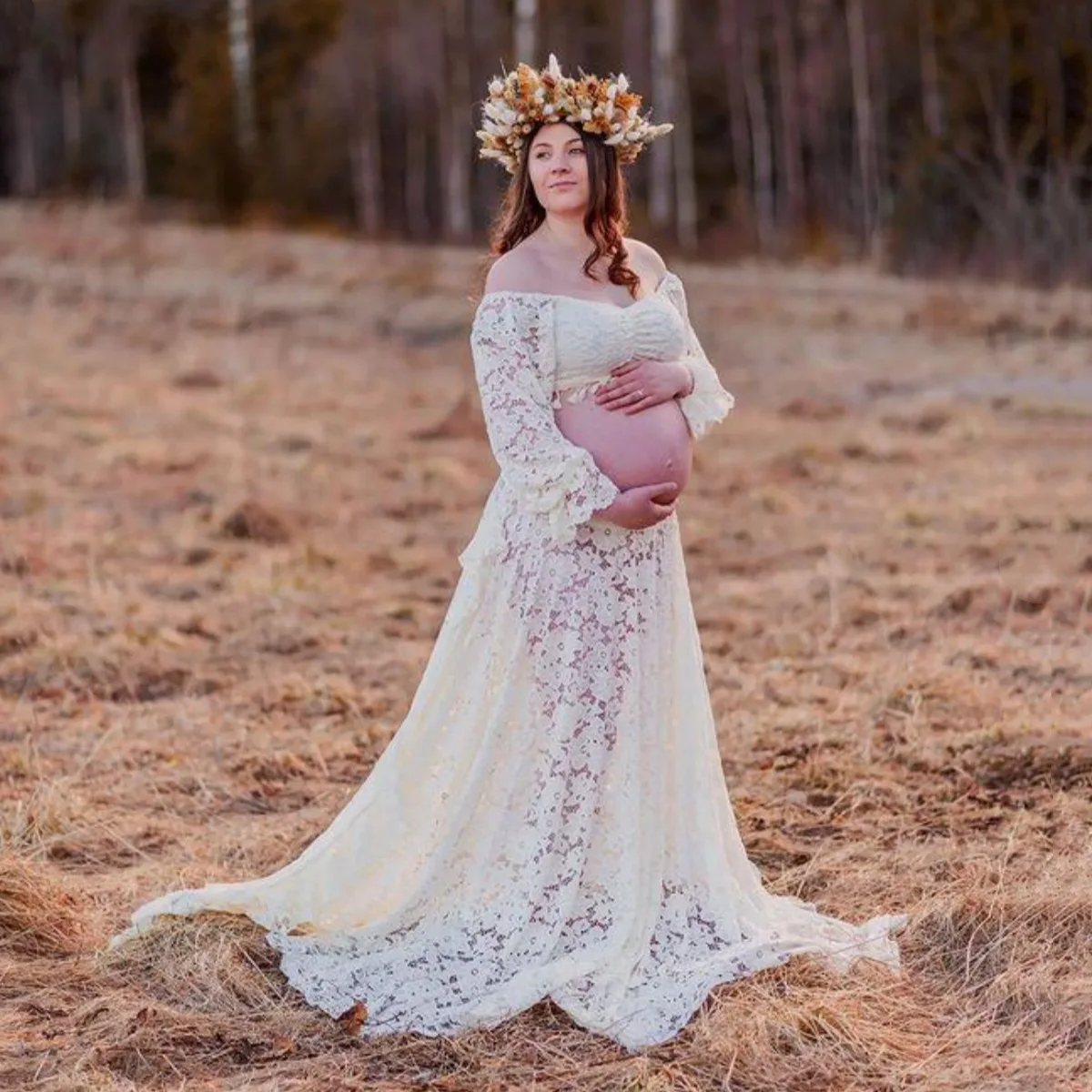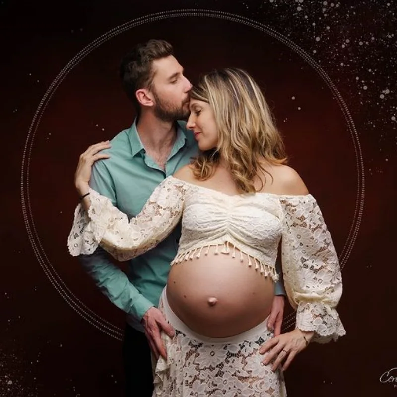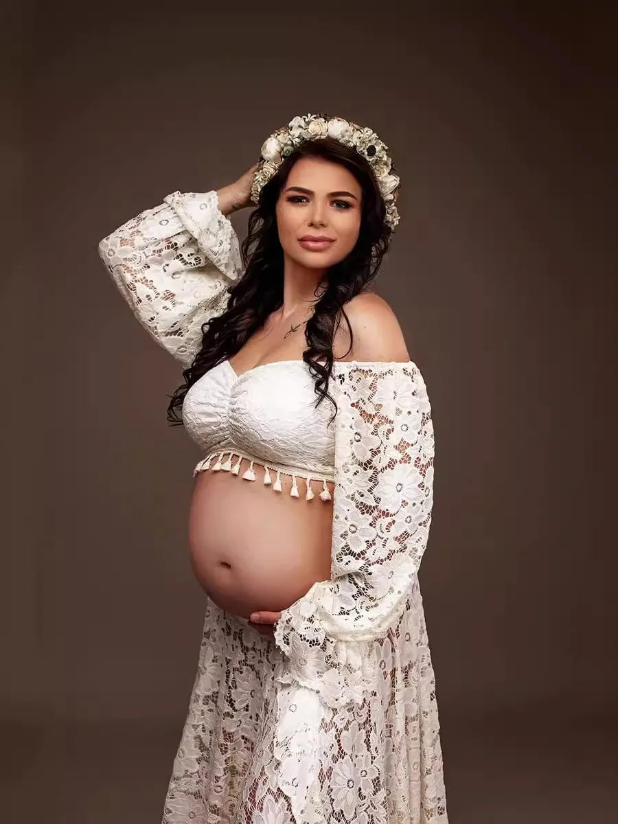 2-in-1 Maternity Photo Dress Set Fringe Lace Two-Piece Maxi Dress