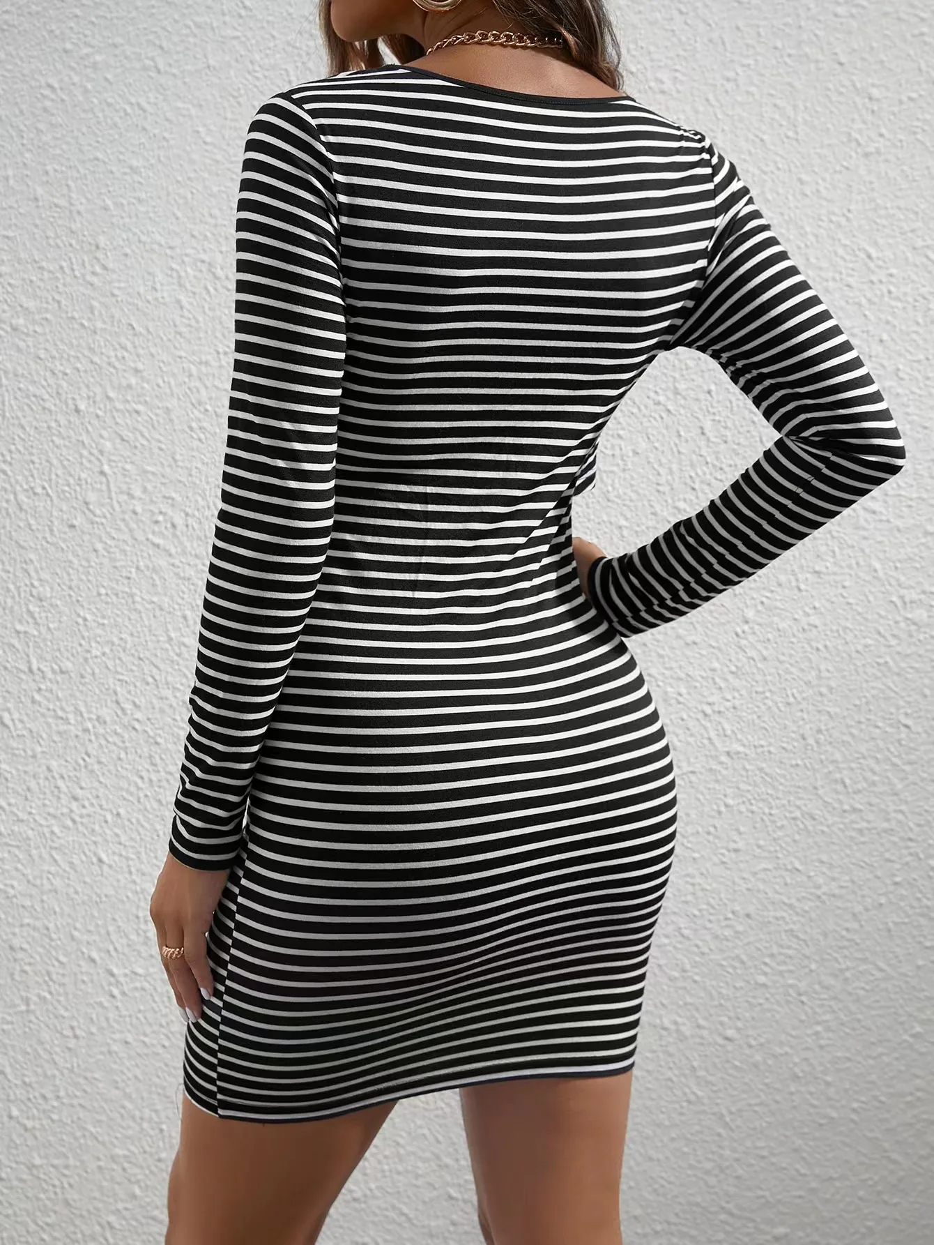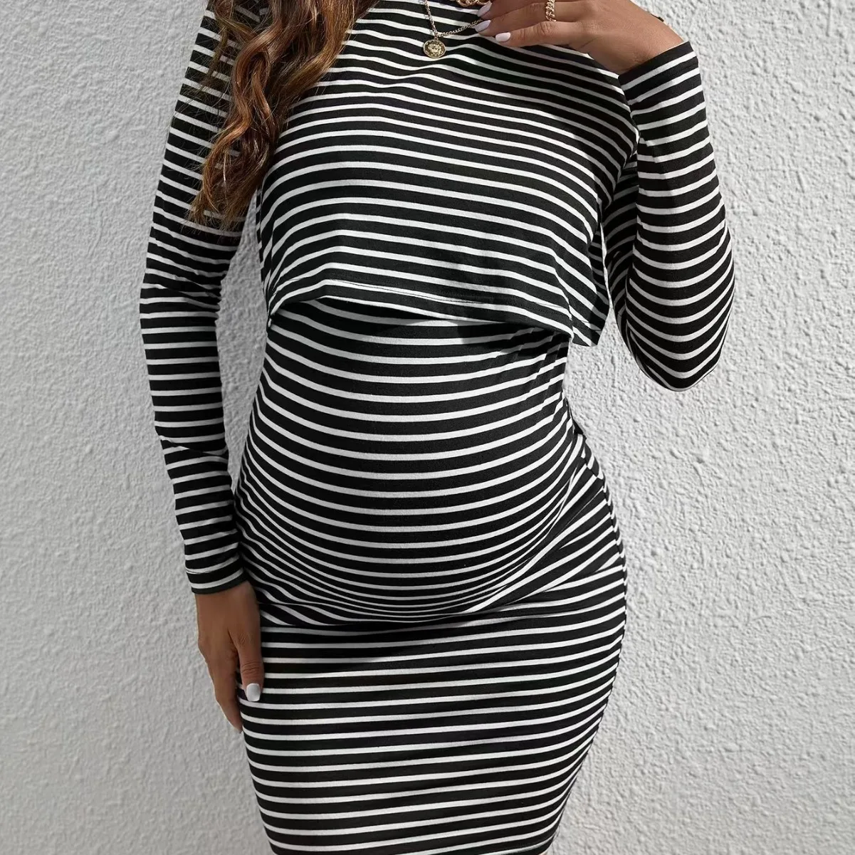 Summer Maternity Dress Skirt with Round Neck Long Sleeves Stripe Knitted Fabric Plus Size Breastfeeding Features Spring Autumn