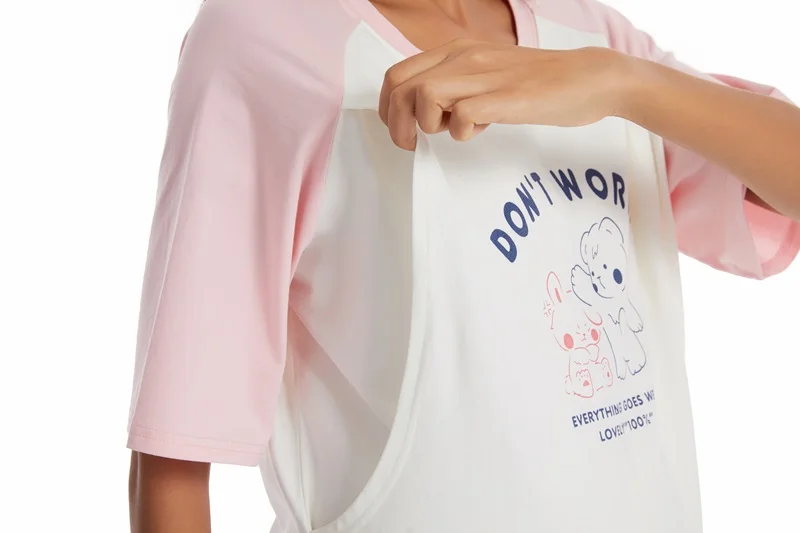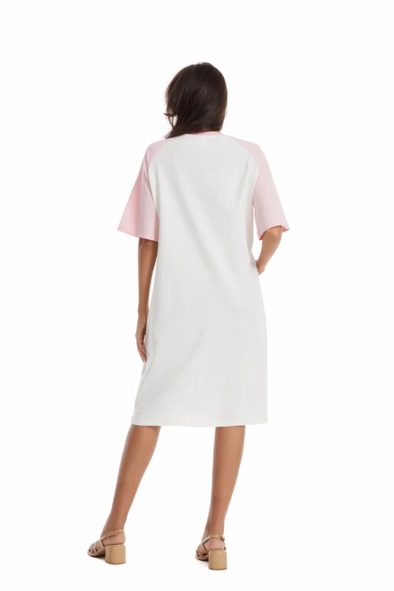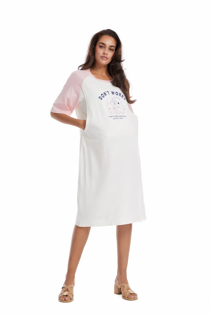 White and Pink Patchwork Print Breastfeeding Maternity Dress Short-Sleeved and for Spring & Autumn Seasons