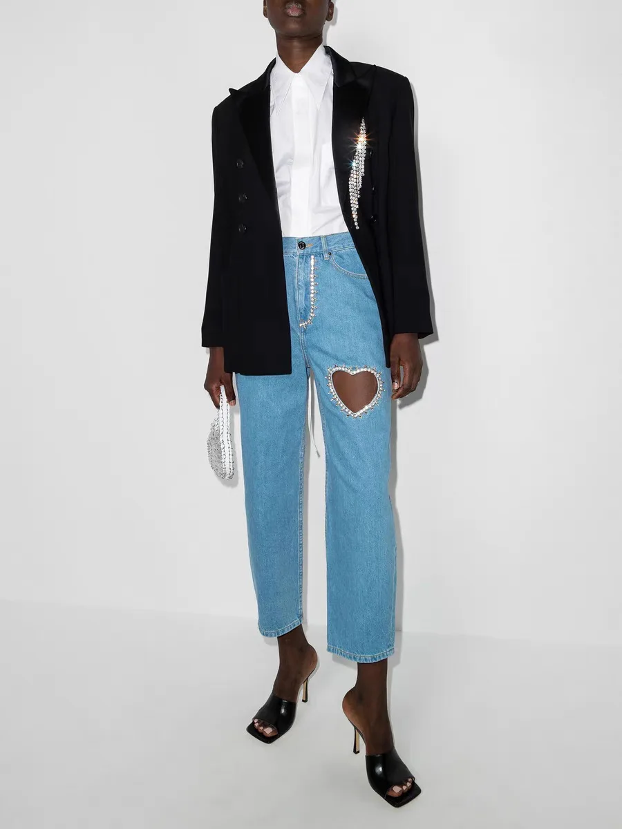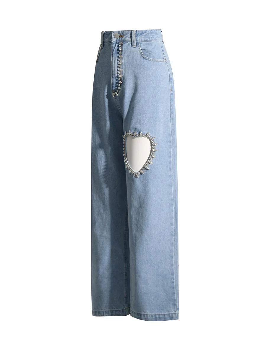 2026 Spring New Washed Rhinestones Hollowed-out love Decorated Jeans Fashionable Loose Slimming Straight Leg Pants for Women