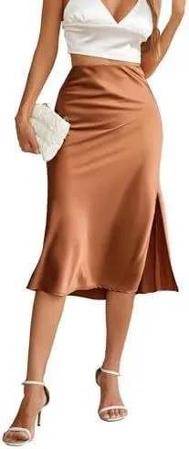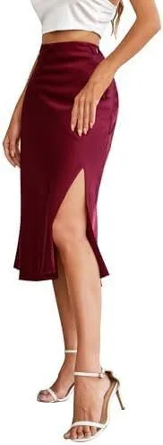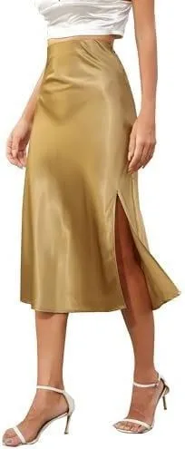 Womens Silky Satin Midi Skirt High Waist Elastic