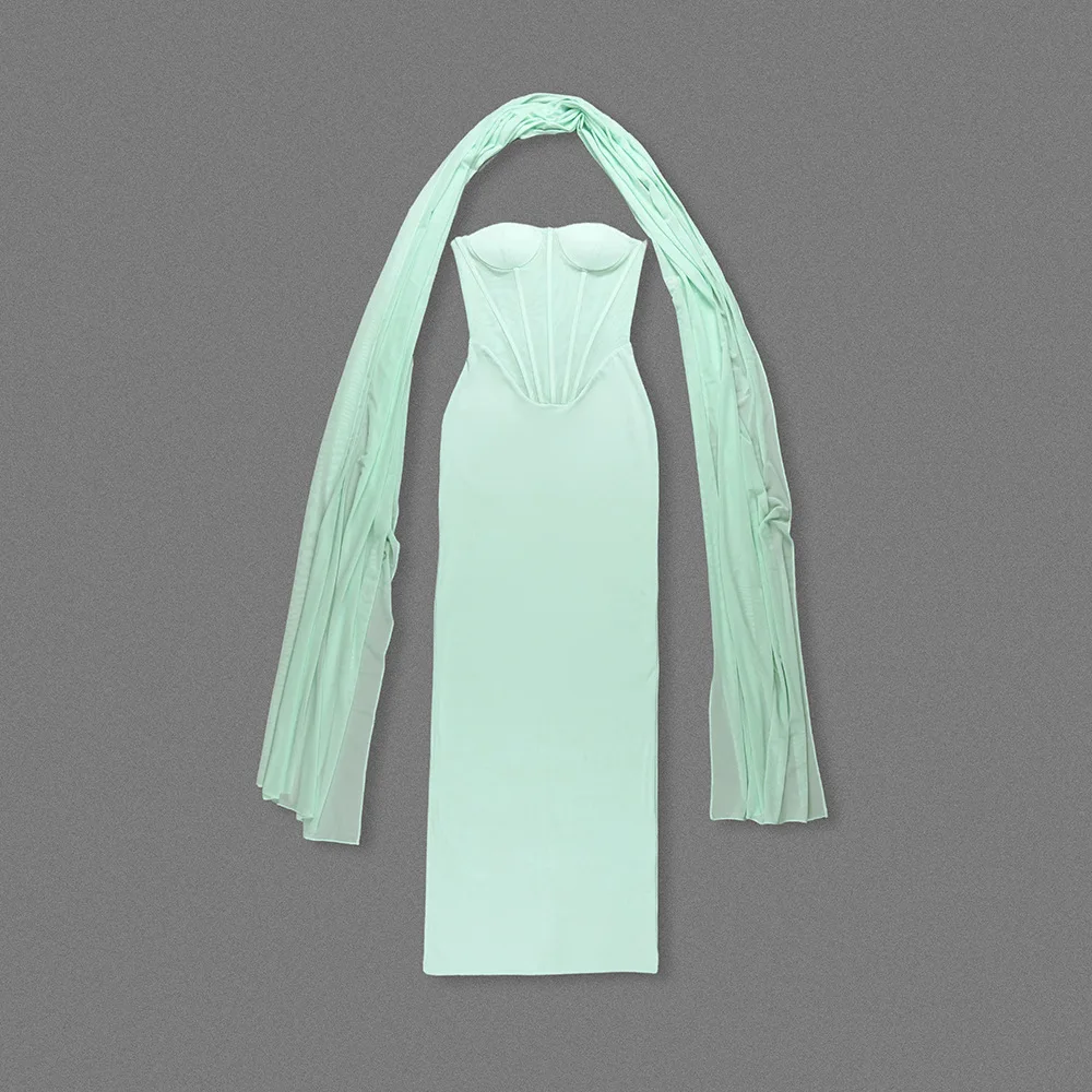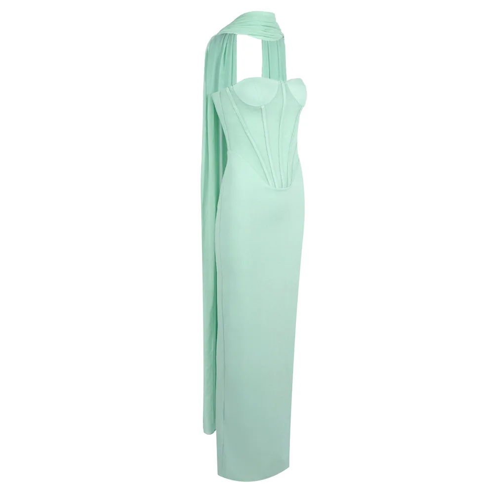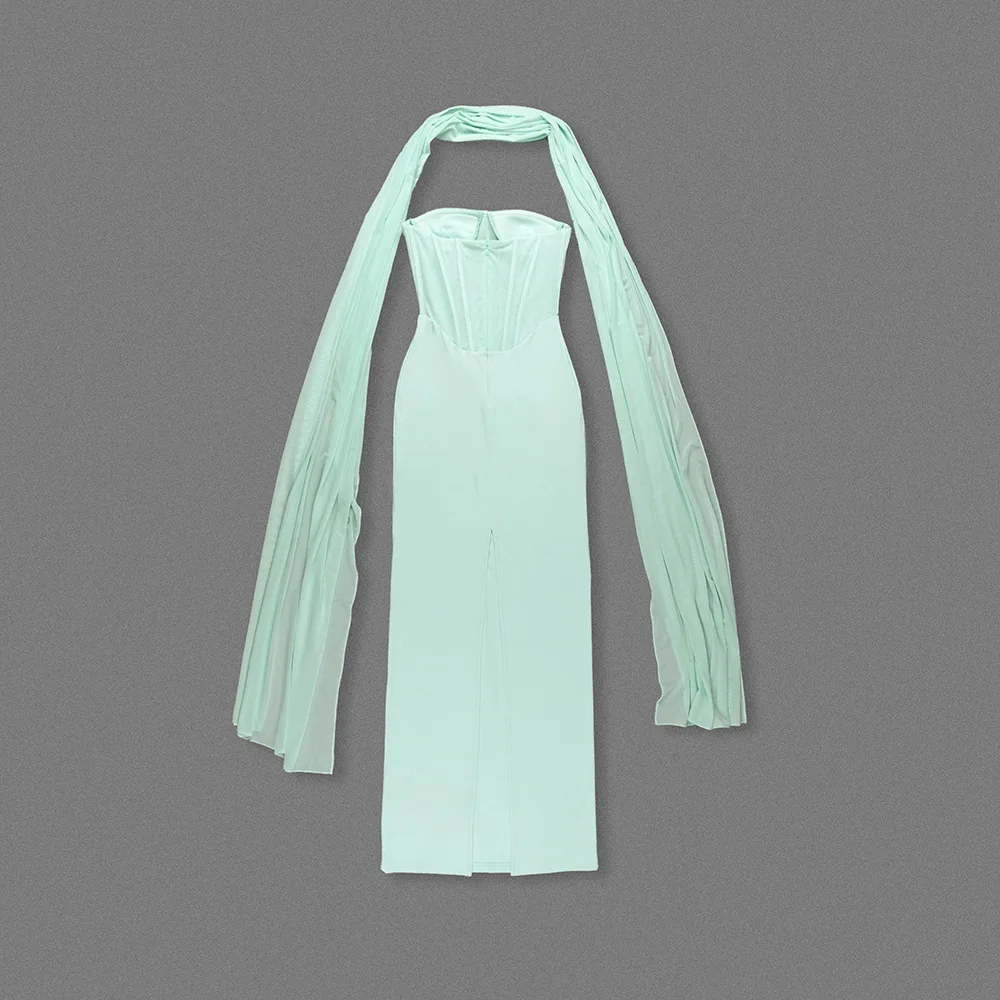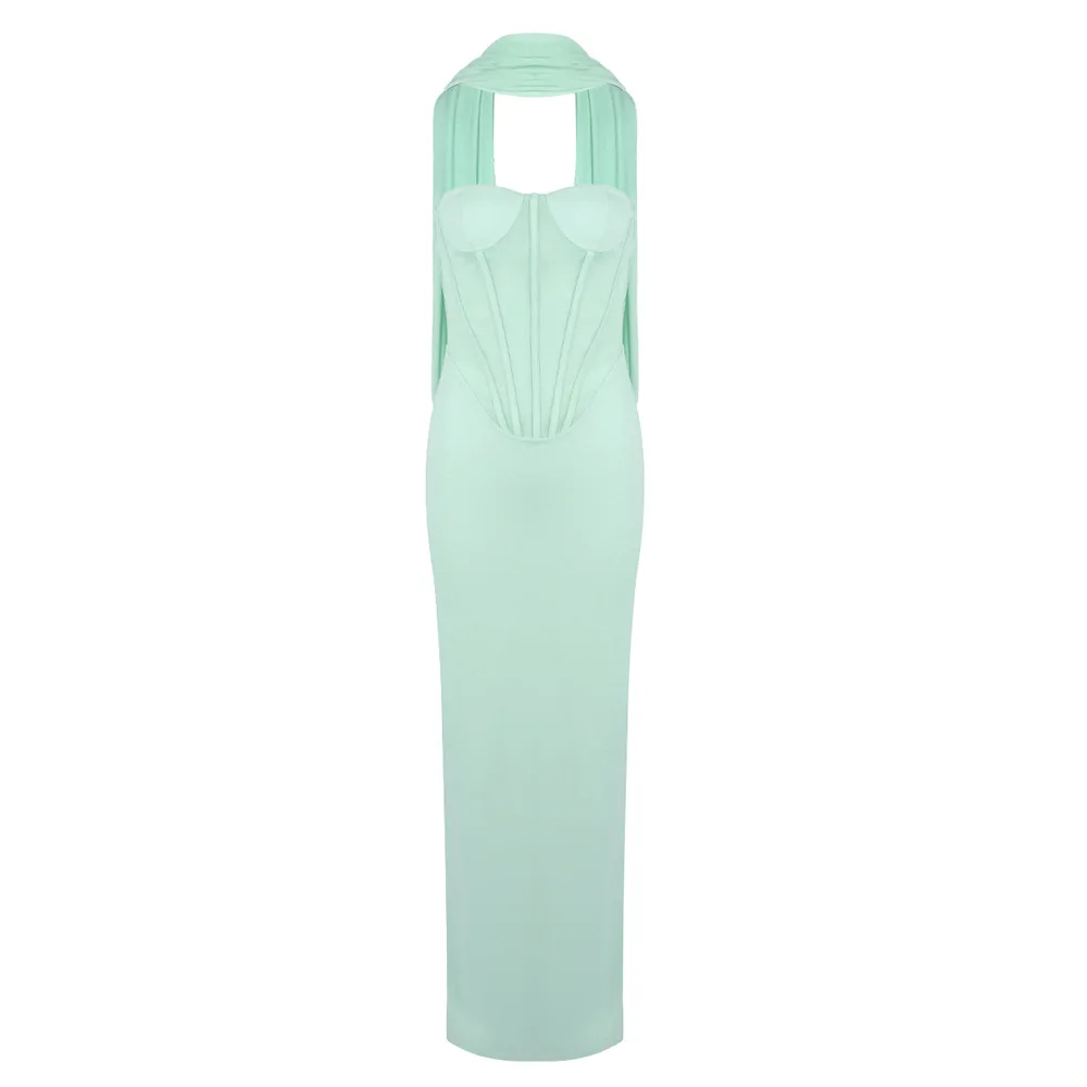 Custom Summer New Light Green Halter Neck Tulle Ribbon Dress Slim High Waist Floor-length Dress for Women