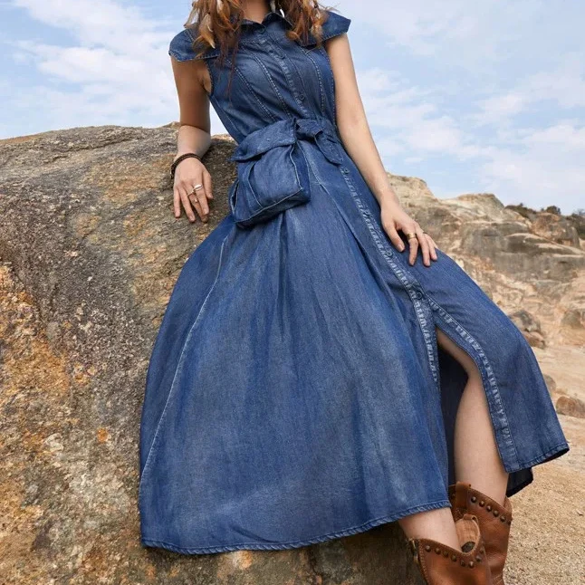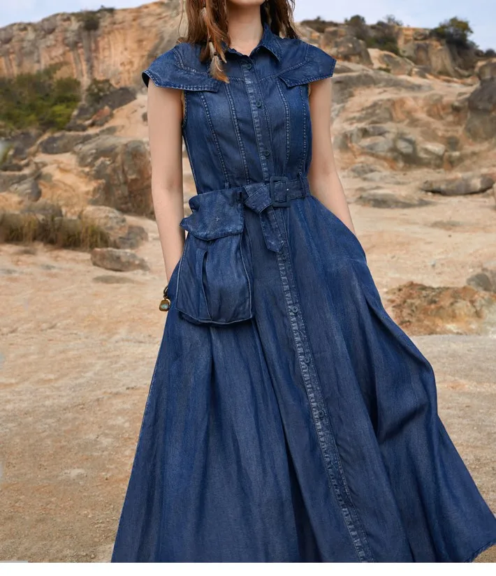 2026 Summer New Fanny Pack Lace-up Denim Long Dress With Waist Temperament Sleeveless Plus Size Dresses 4xl 5xl 6xl 7xl