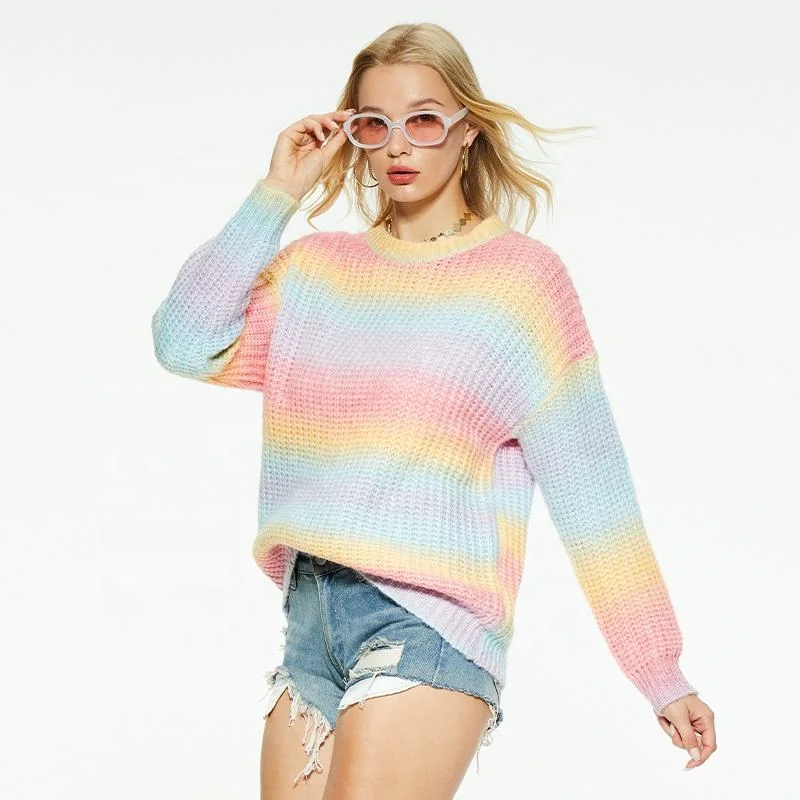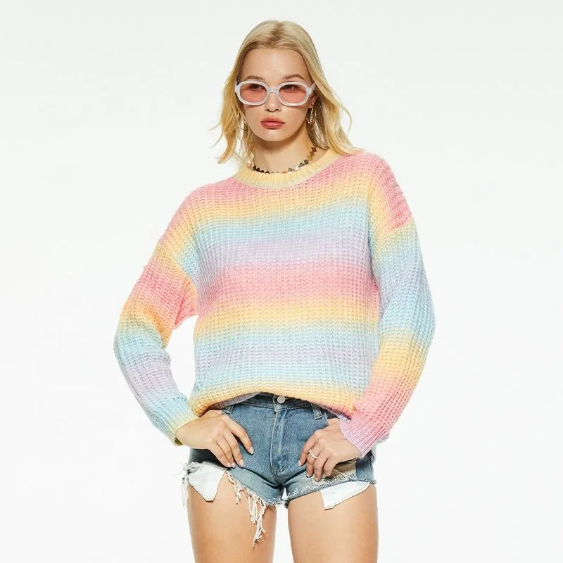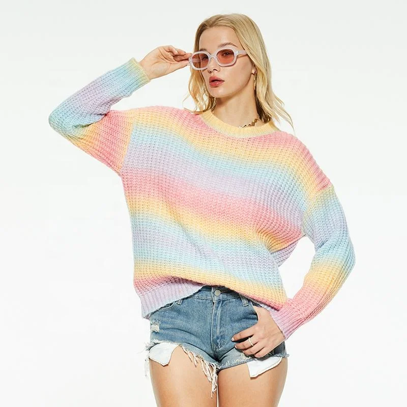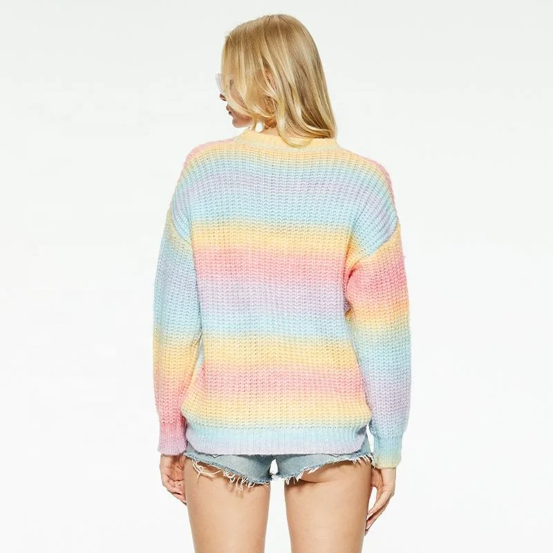 Custom Women's High Collar Breathable Knit Top Spring Striped Long Sleeve Rainbow Pullover Sweater Casual Style