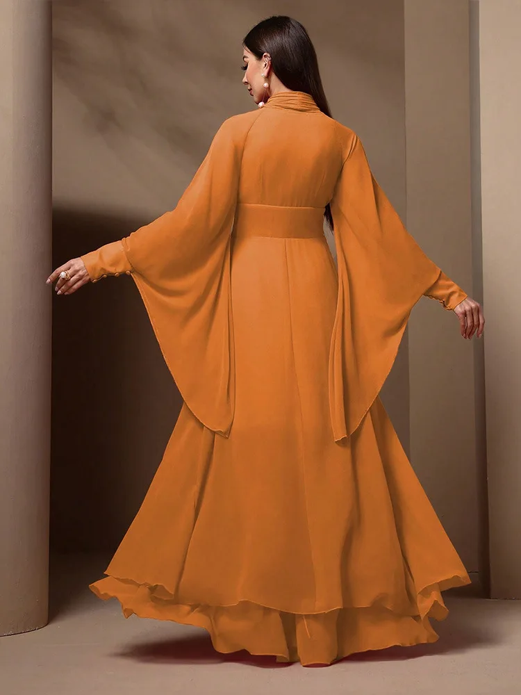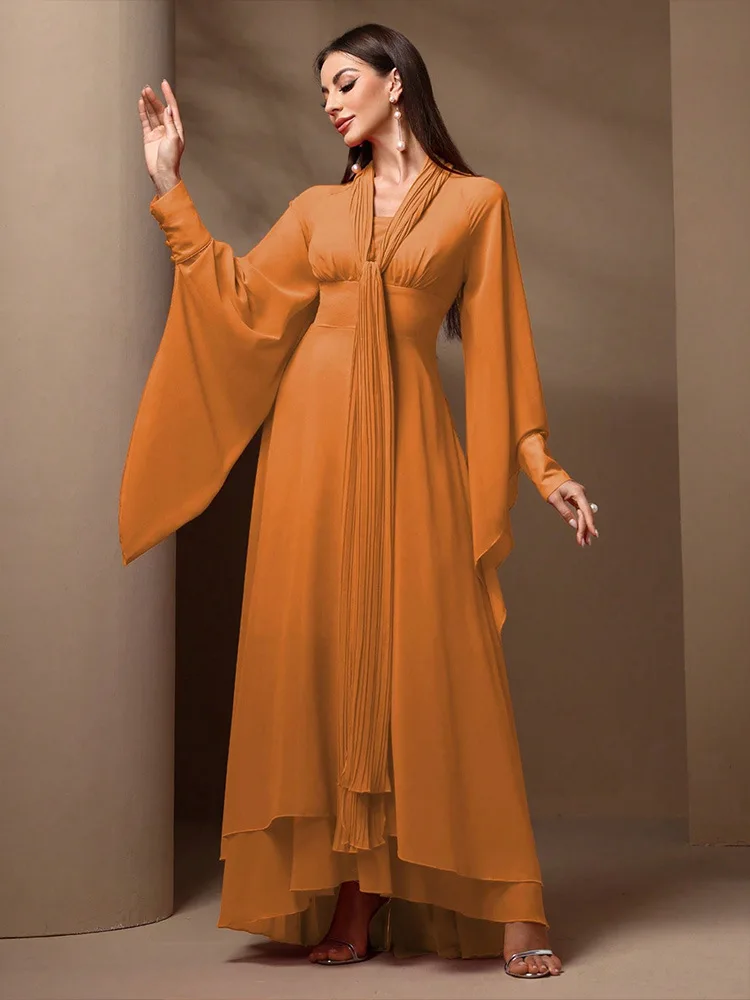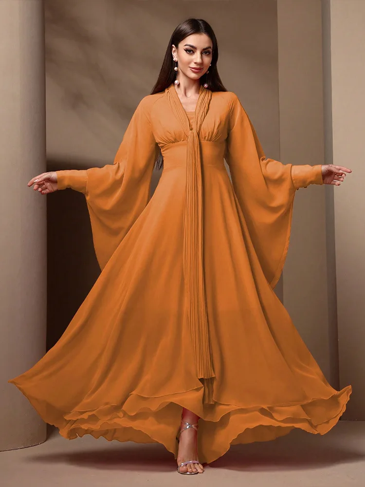 New Fashionable Elegant Temperament Chiffon Ruffled Long-sleeved Backless Waist Dresses