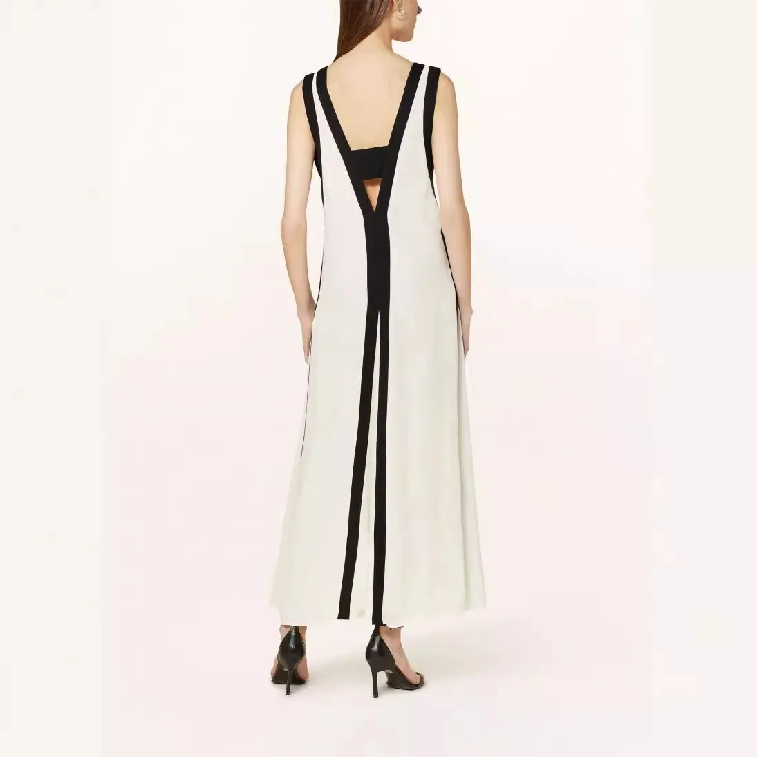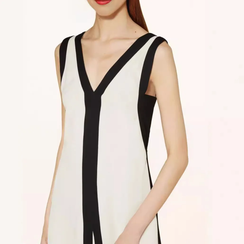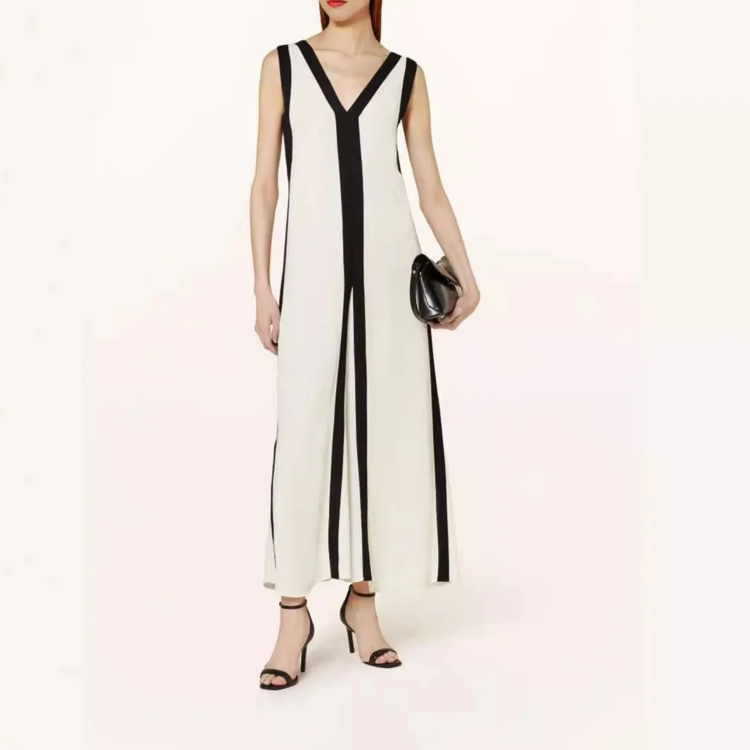 Wholesale Summer Ladies Elegant V-neck Sleeveless Striped Knitted Dress Double Sided V-neck Contrast Casual Dress