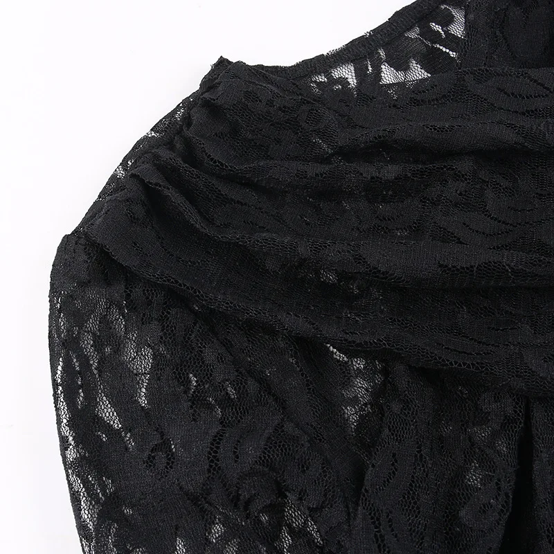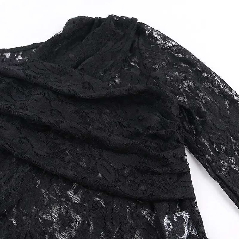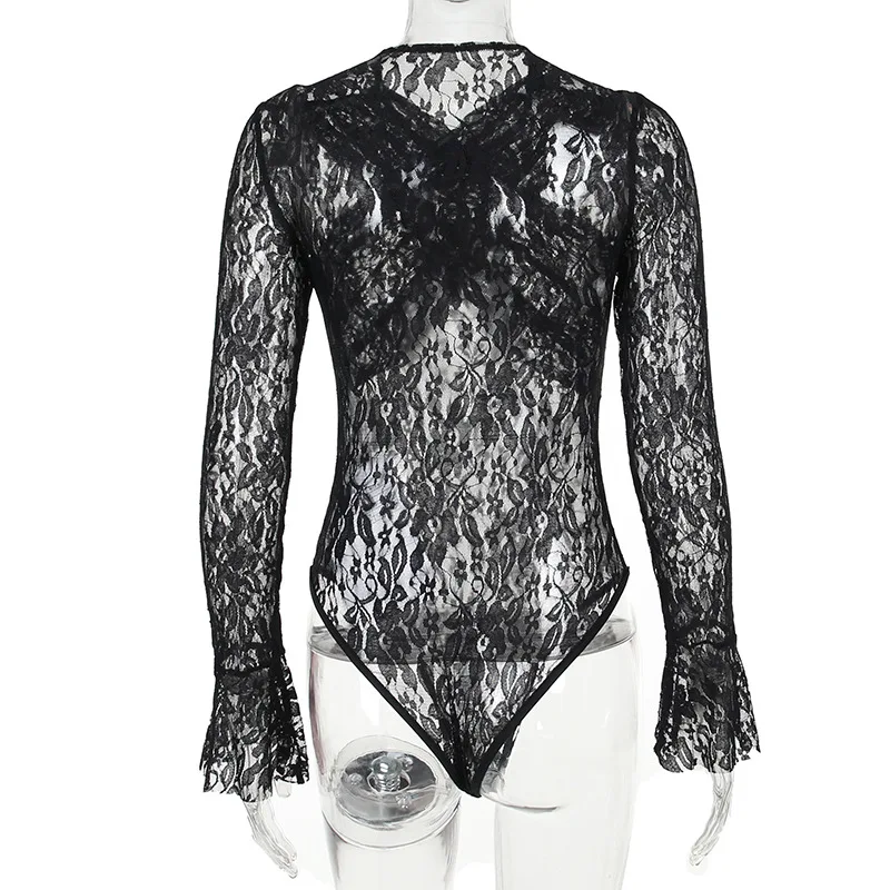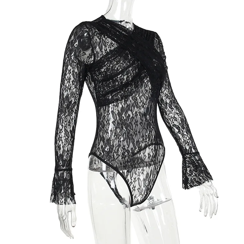 2026 Custom Logo Summer New Sexy Slightly Sheer Tops with Embossed Lace Cross Long Sleeve Women's Jumpsuit