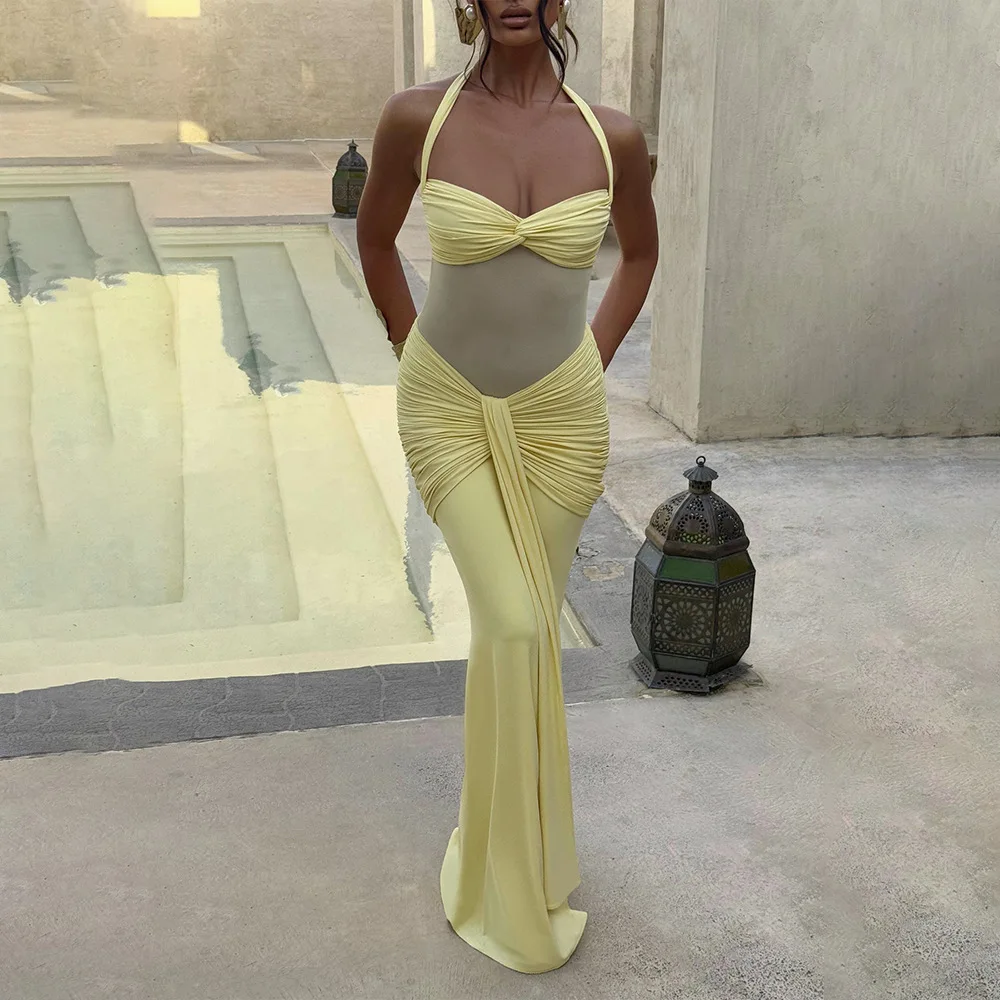 Solid Color Sexy Halter Neck Sleeveless Dress Mesh Women's Dresses Shirring Ladies Beach Wear Summer Women's Clothing