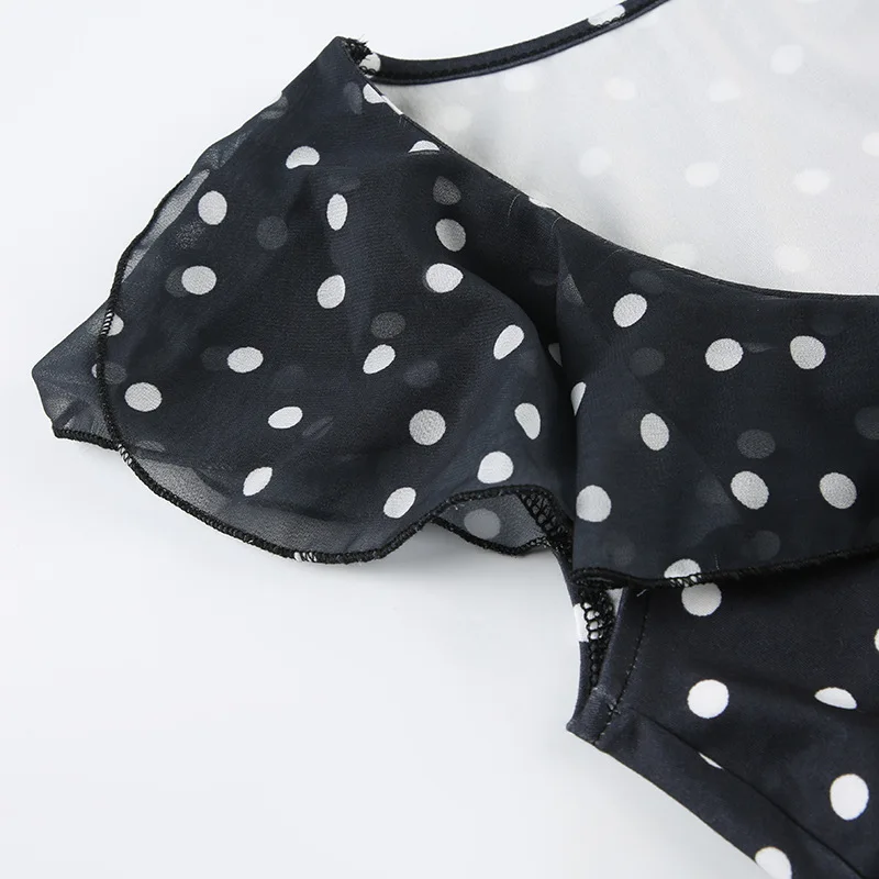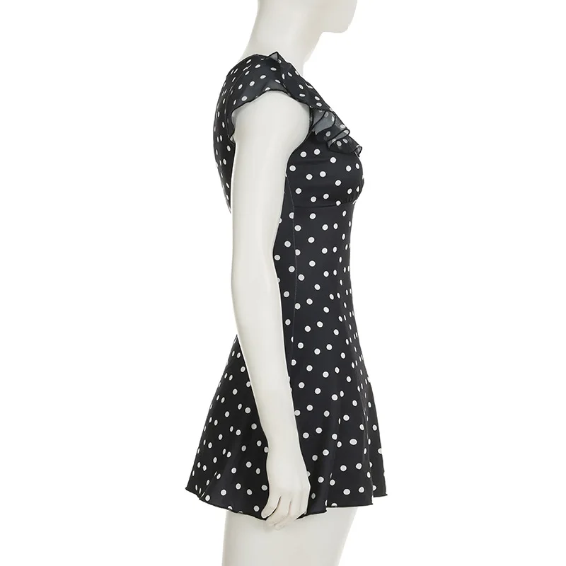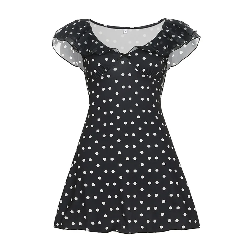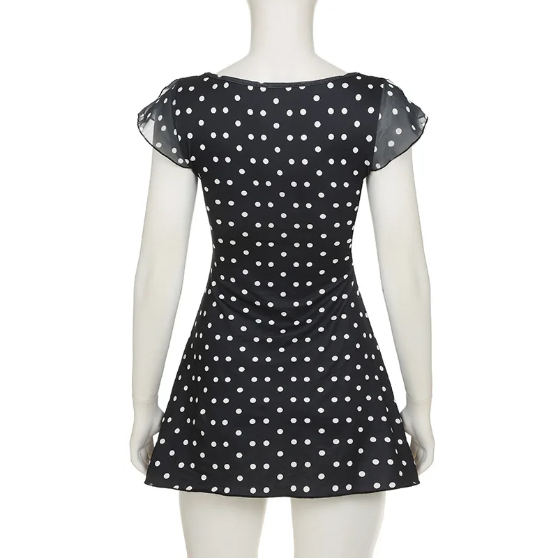 2026 Short A-line Dress with Flutter Sleeves, Polka Dots, Color Blocking, V-neck and Waist Cinching Design.