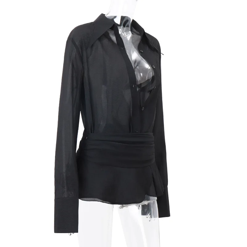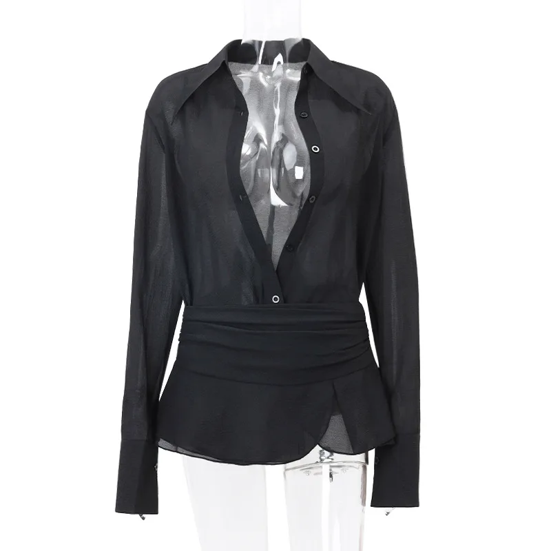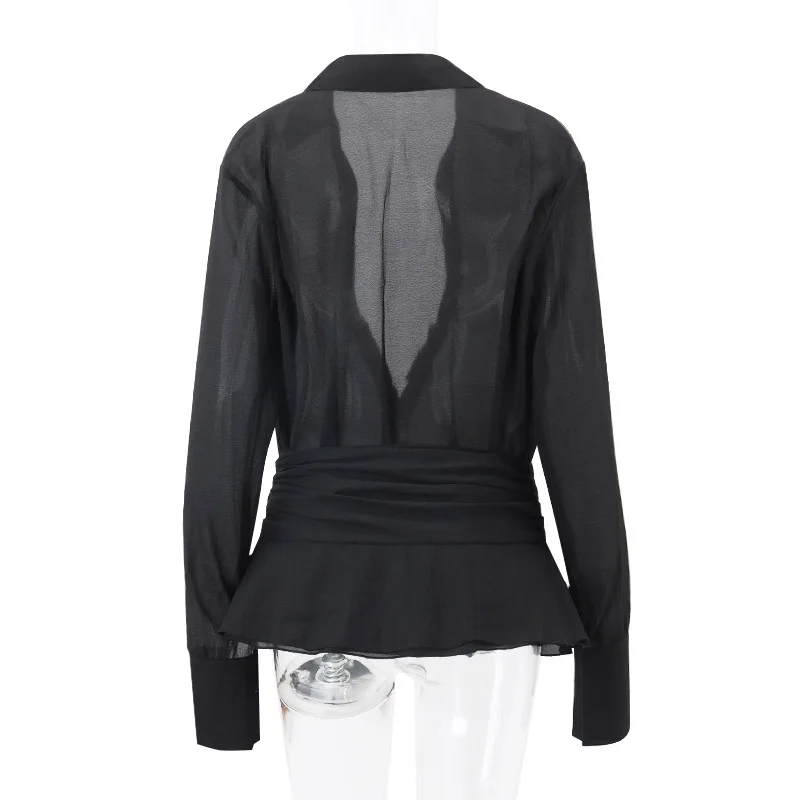 INS Trendy Hot Girl Lapel Waist-cinched Cardigan with Slightly Sheer Long-sleeved Shirt and Temperament Short Skirt Set