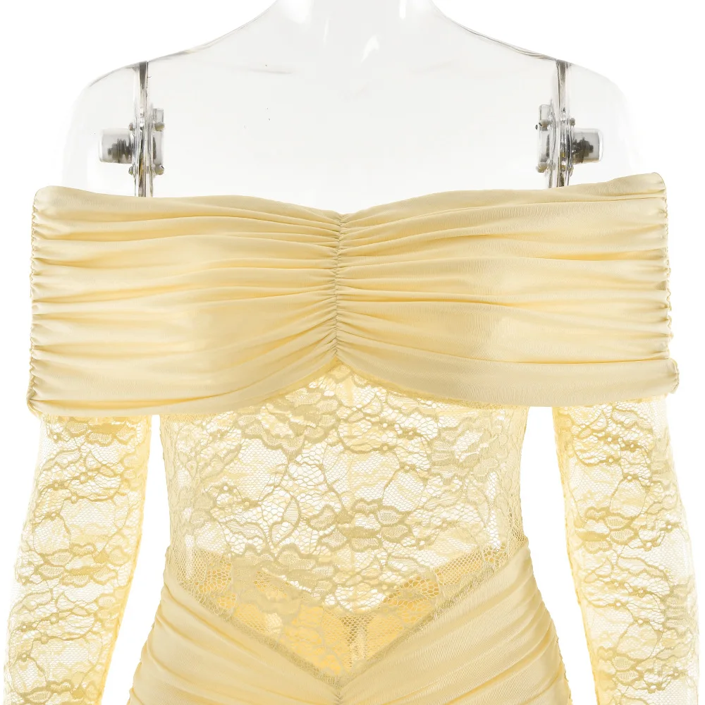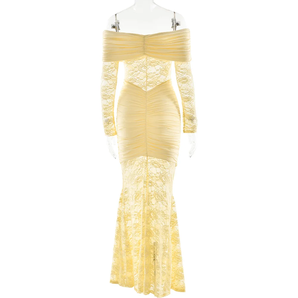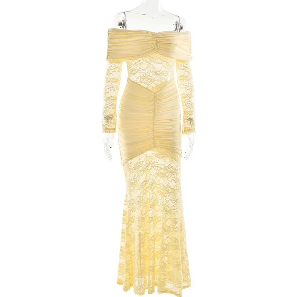 Women's Temperament Lace Patchwork One Shoulder Slit Long Sleeved Pleated Long Skirt Dress