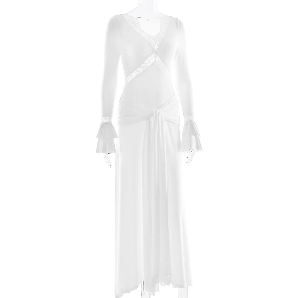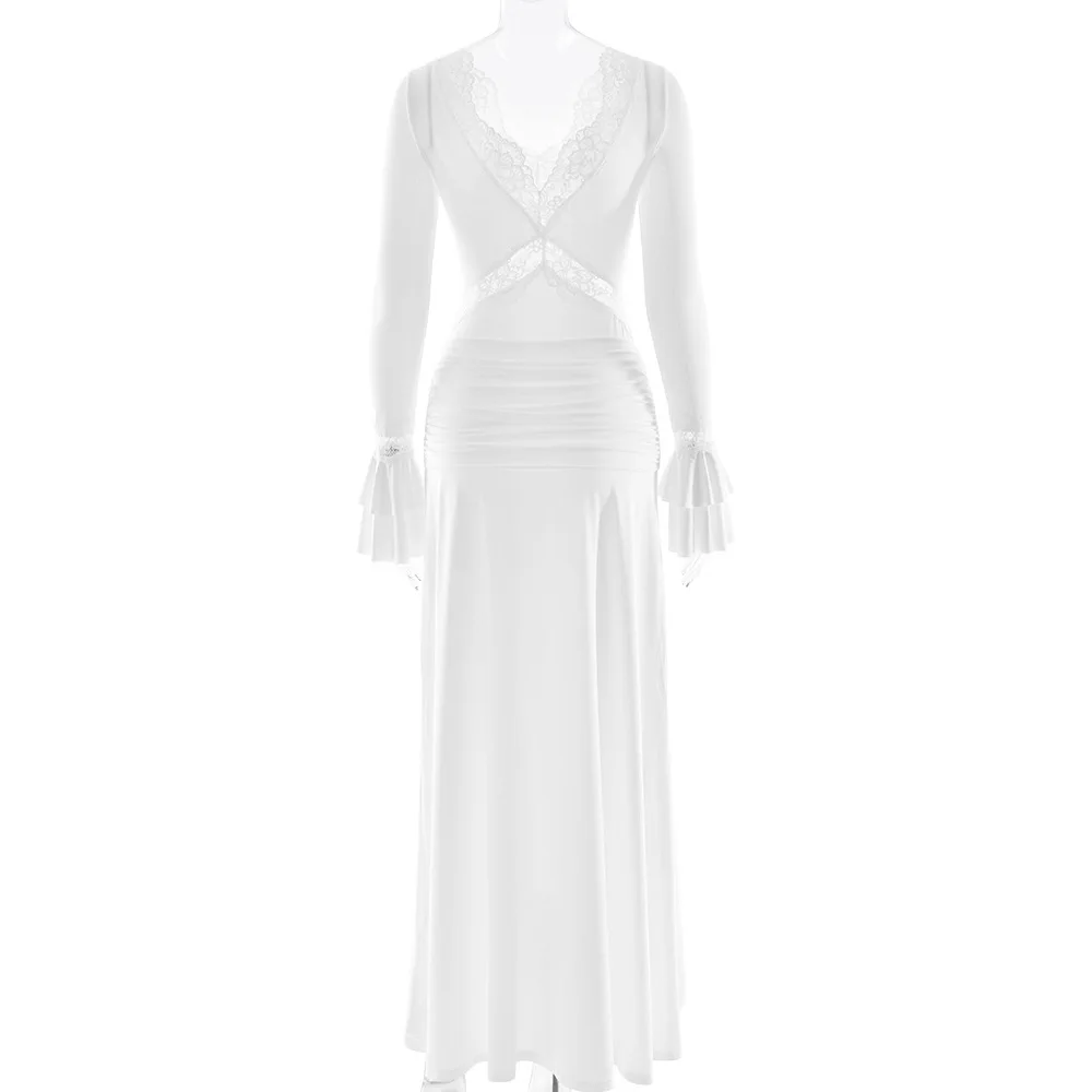 Luxury-clothing New Solid Color Lace-up Women's Dress Long Sleeved V-Neck Chest Hugging Tight Temperament Long Dress