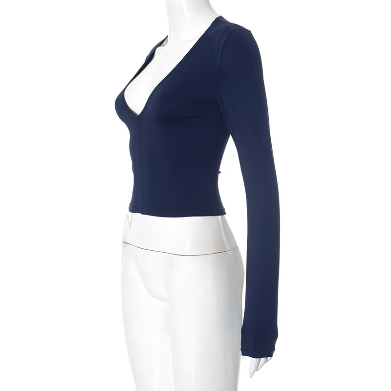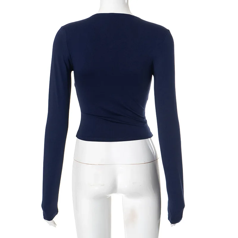 2026 Women's Fashionable Autumn-winter Sexy V-neck Solid-color Crop-top with Frayed Seams and Long Sleeves T-shirt