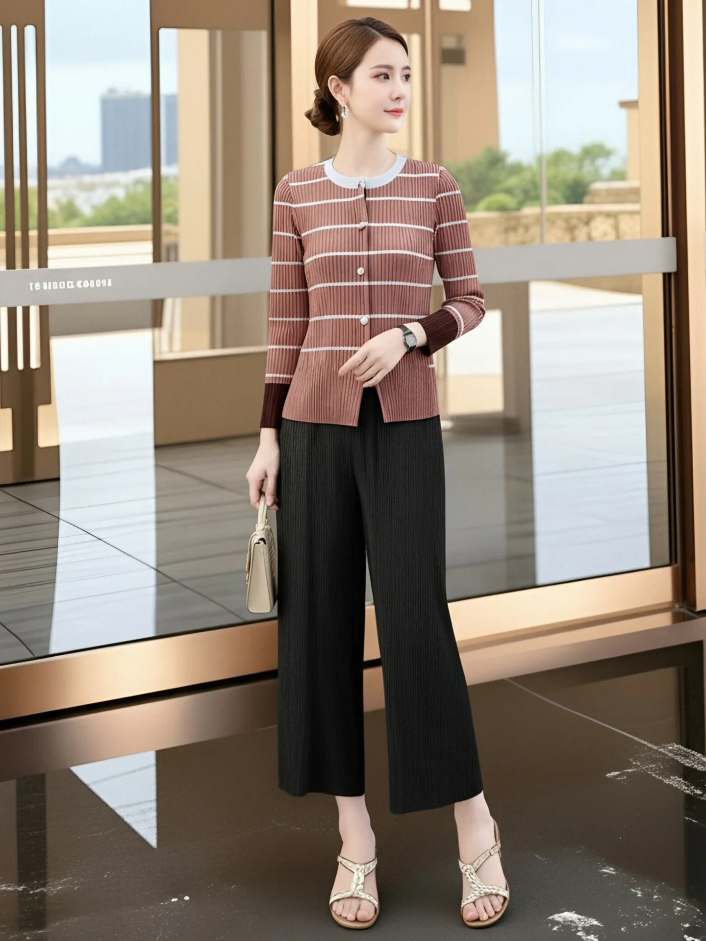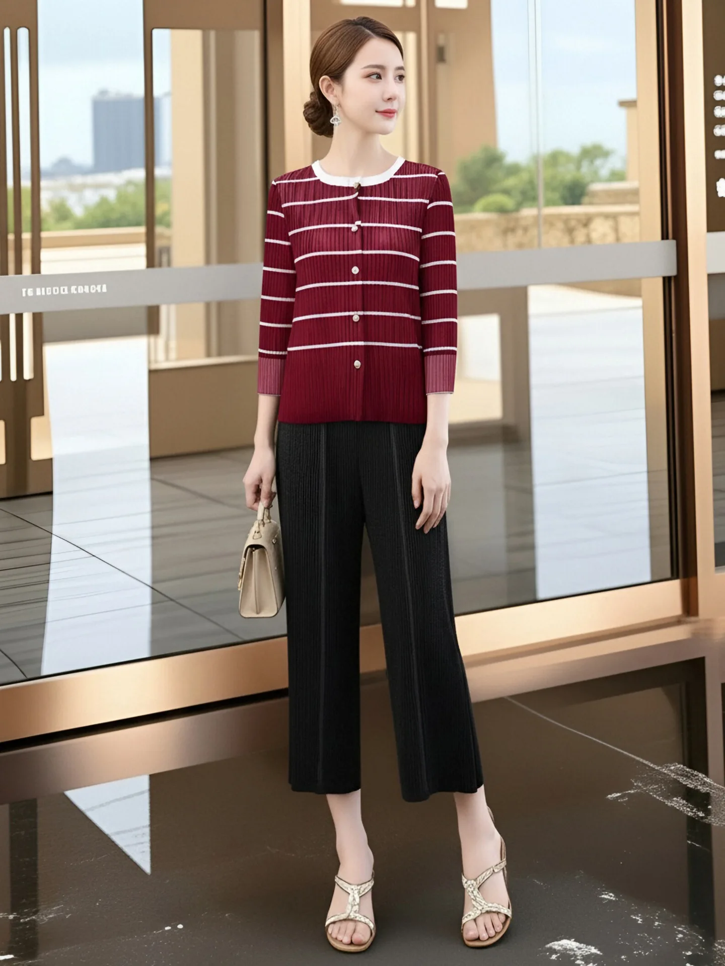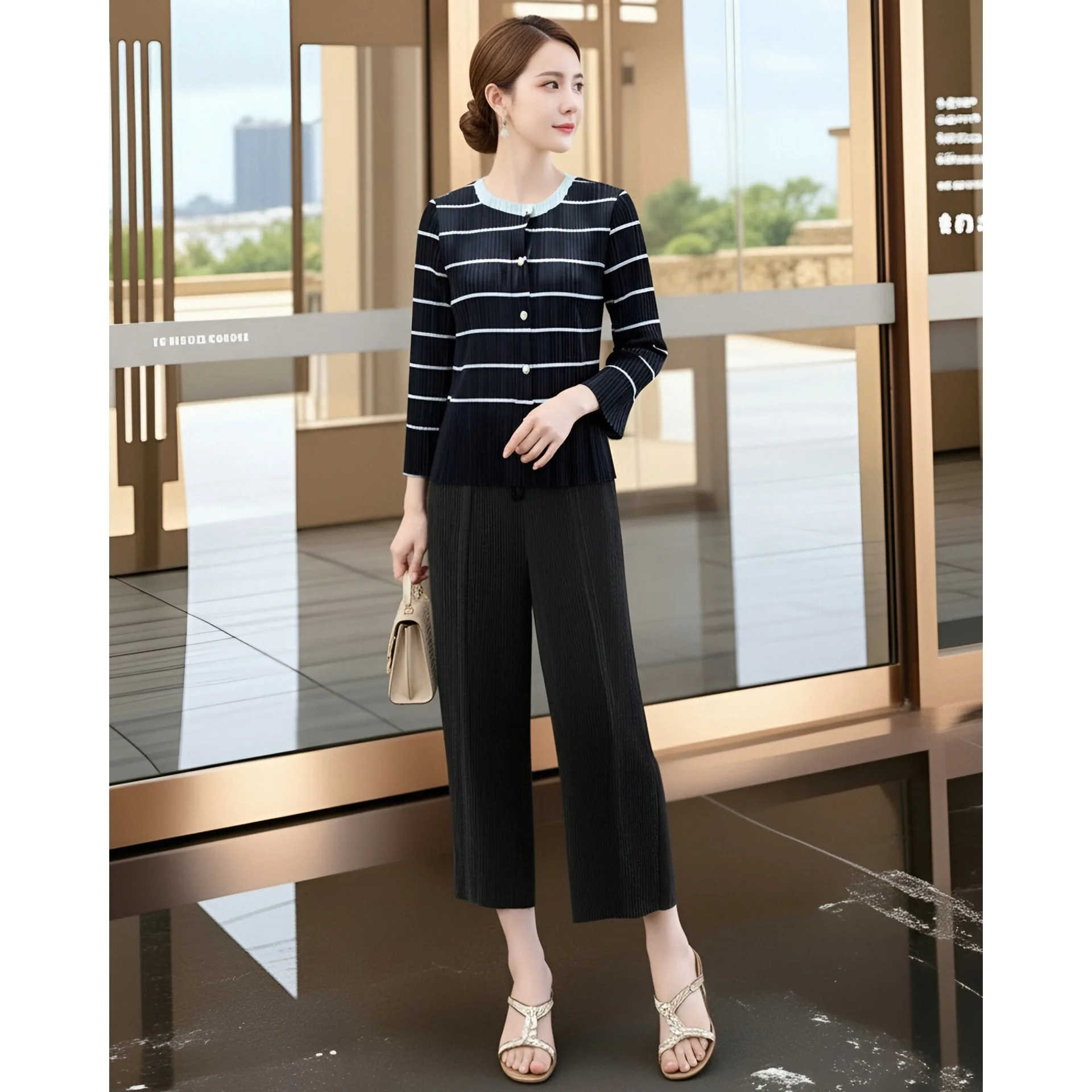Hong Kong-style Black Shirt Women's High-end Light Luxury Age-reducing Long-sleeved Miyake Red Top Slim Cute Stripes Spring