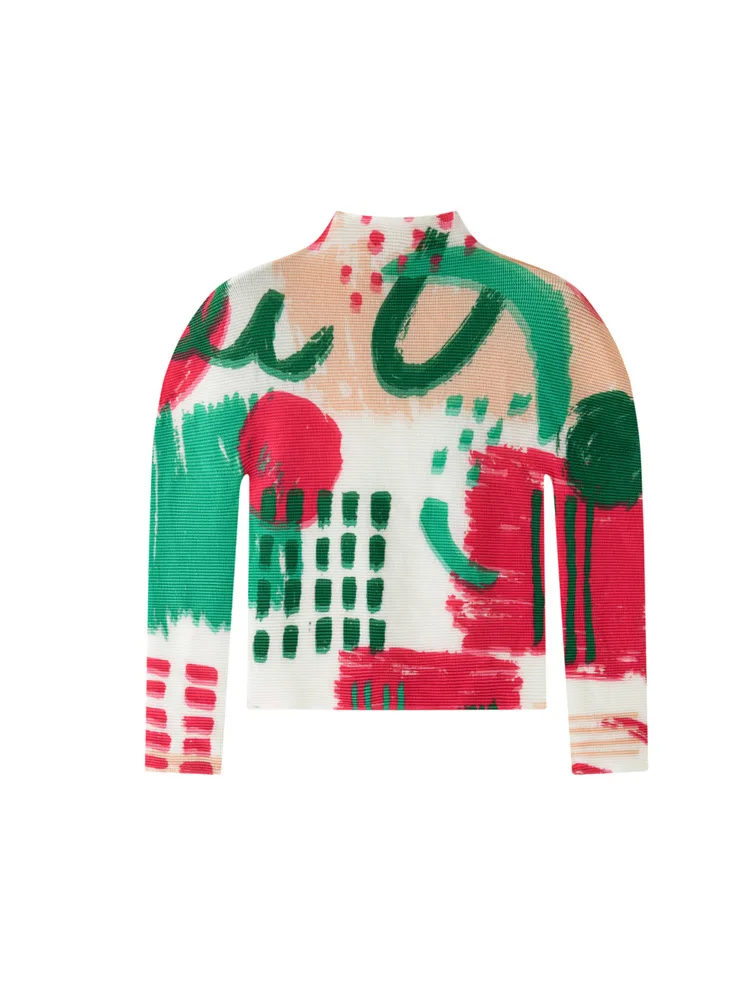Miyake Pleated Cute Women's 2026 Spring Summer New Corn Grain Abstract Printed Small High Neck Long Sleeve Slim Polyester