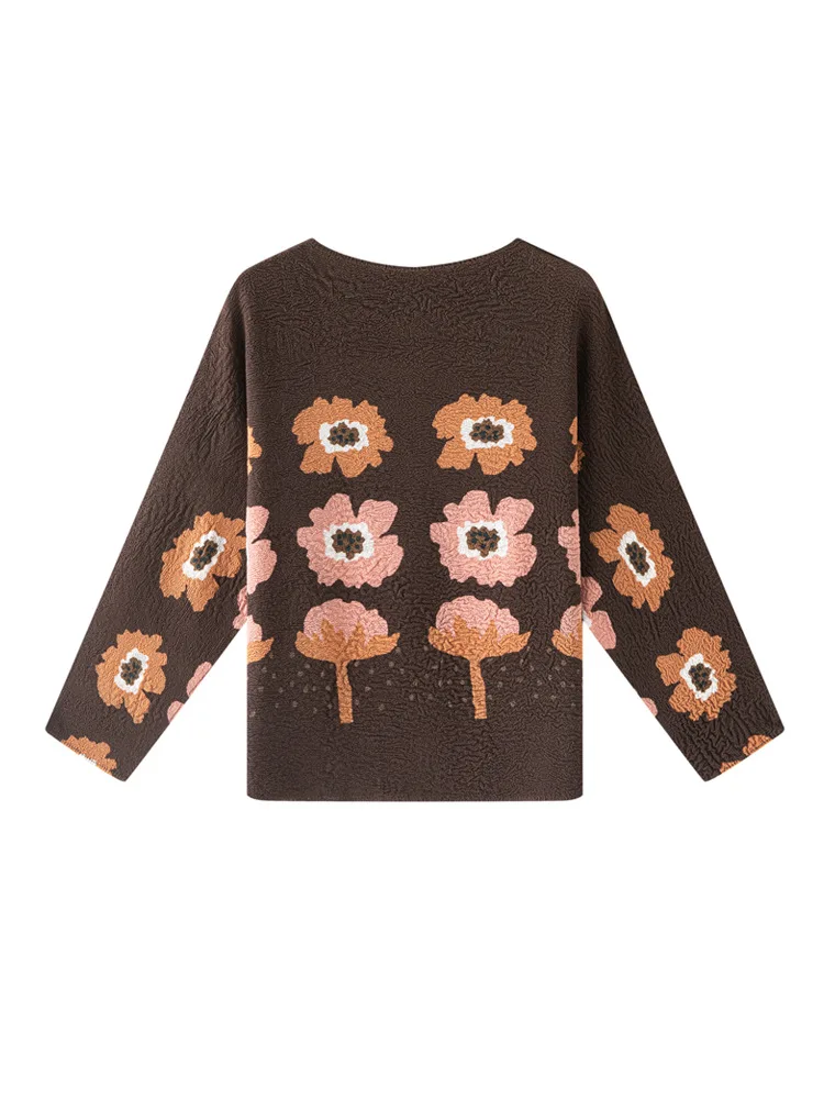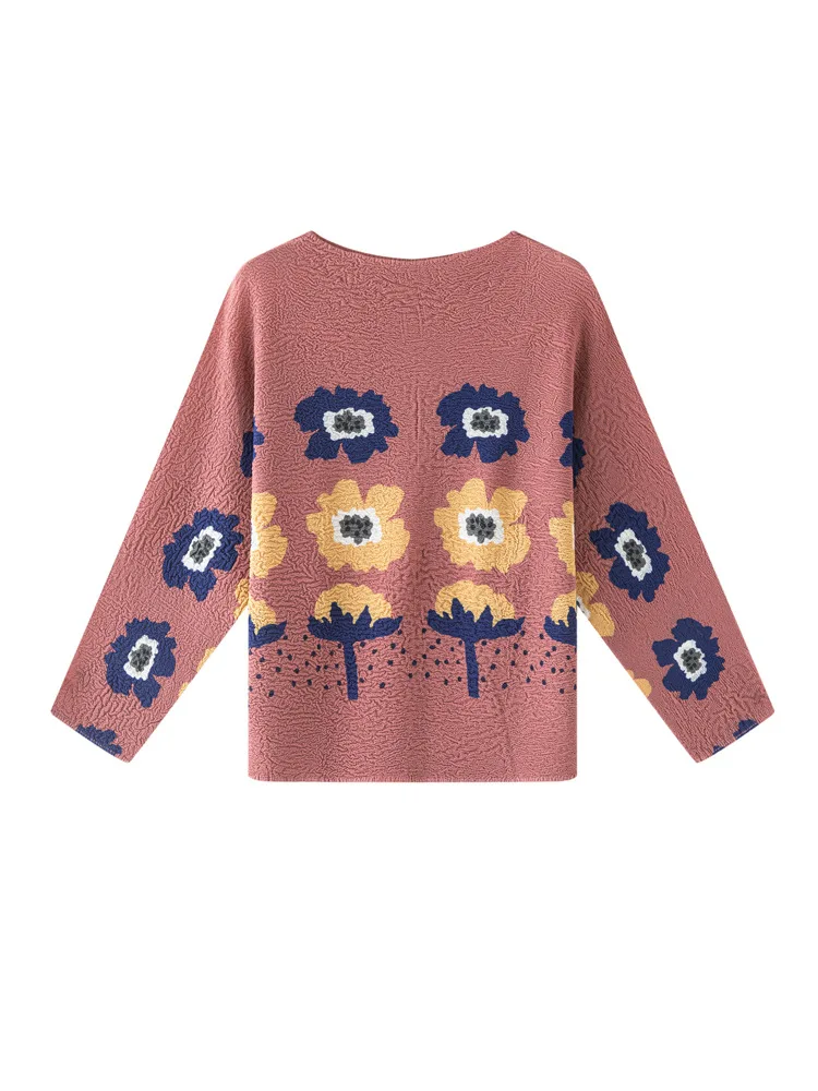 Miyake Fashion Cartoon Flower Printed Polyester Long-sleeved T-shirt Women's Mandarin Collar Pleated Design Loose All-match