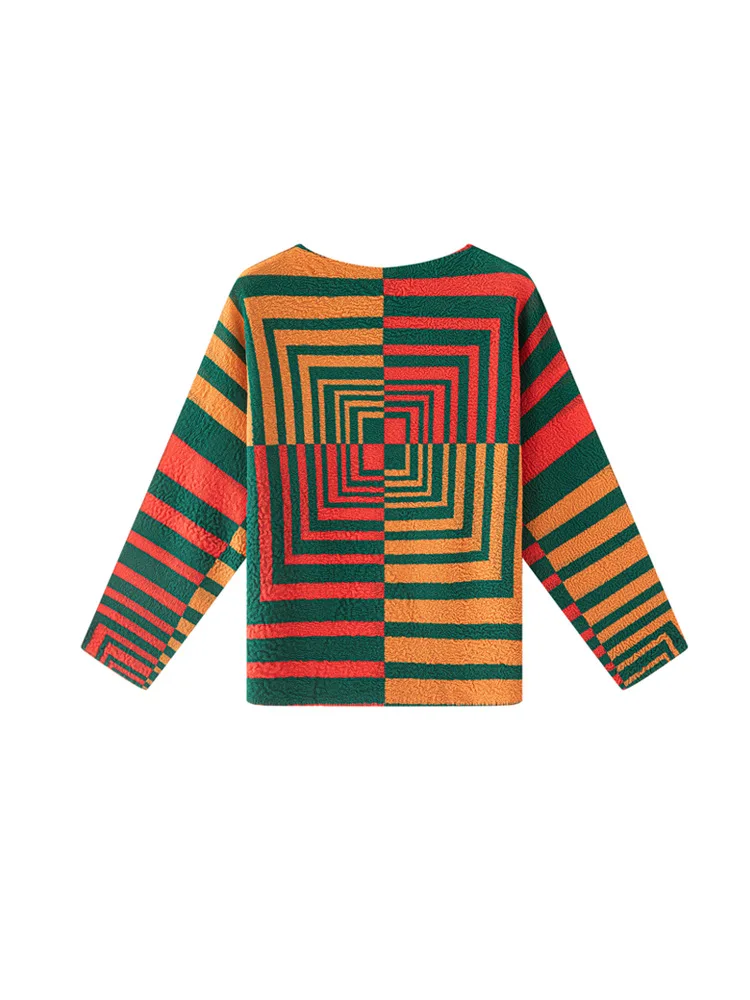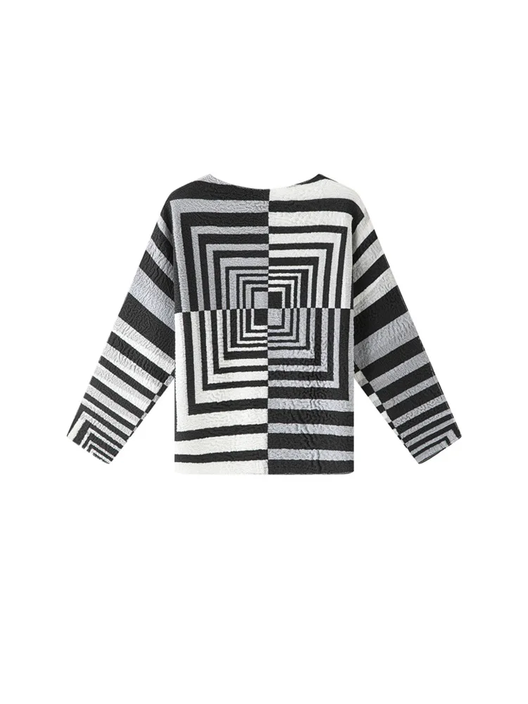 Miyake Spring Polyester Color Contrast Striped Mandarin Collar Long-sleeved T-shirt Women's New Large Size Loose Commuting