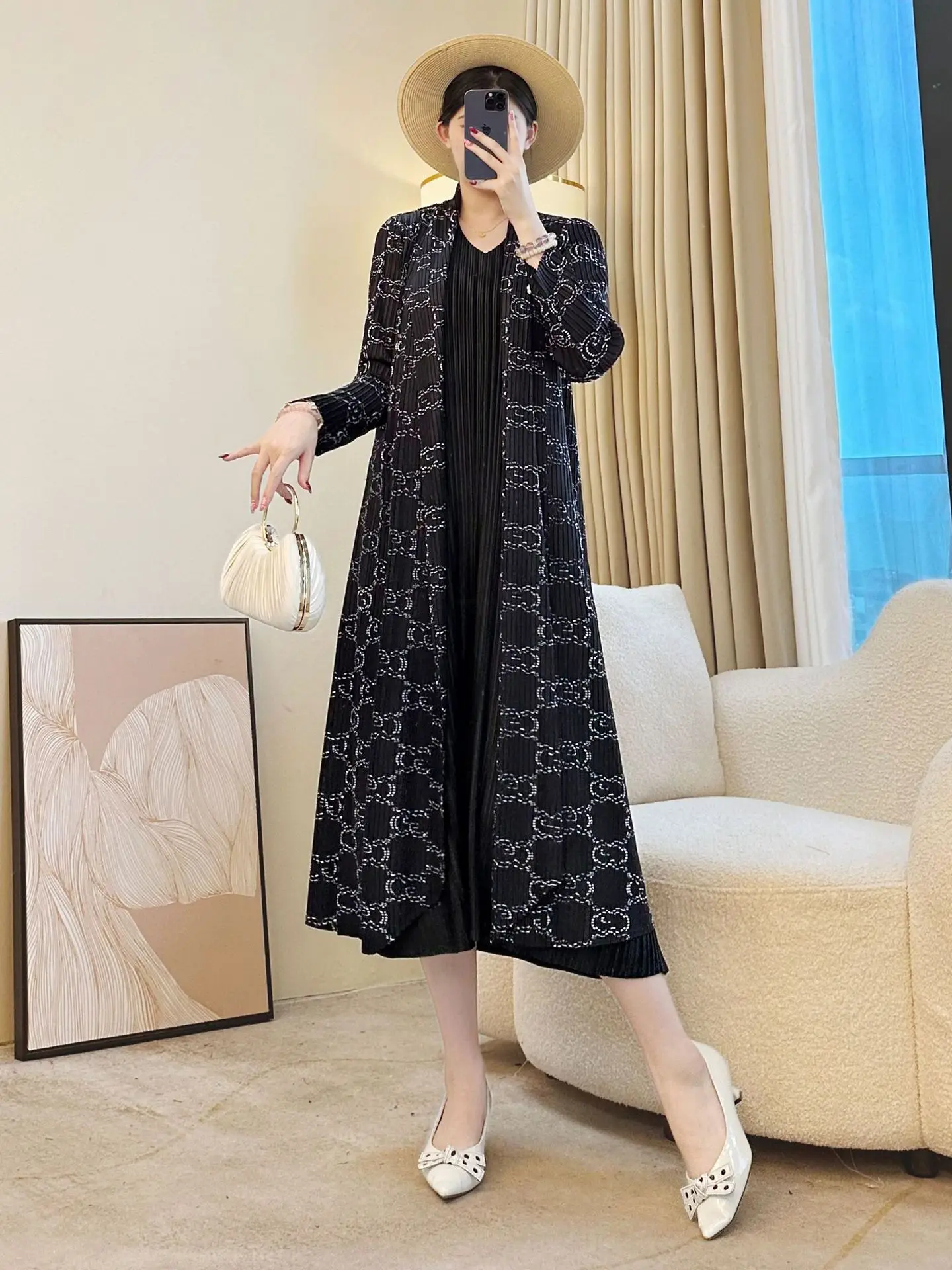 High-end Women's Spring Autumn Elegant Large Size Lapel Long Geometric Pattern Dyed Three House Slim Black Windbreaker Jacket