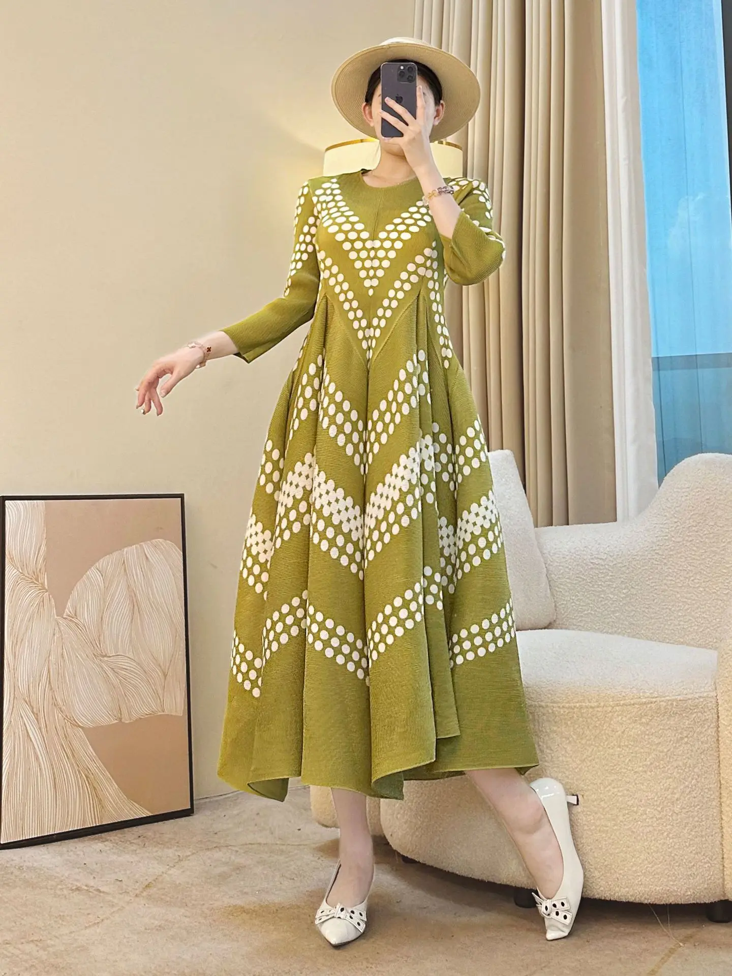 Miyake Pleated Polo Dot Chiffon Casual Floor-Length Dress 2026 Autumn New Mother's Niche Design Loose Slimming Purple