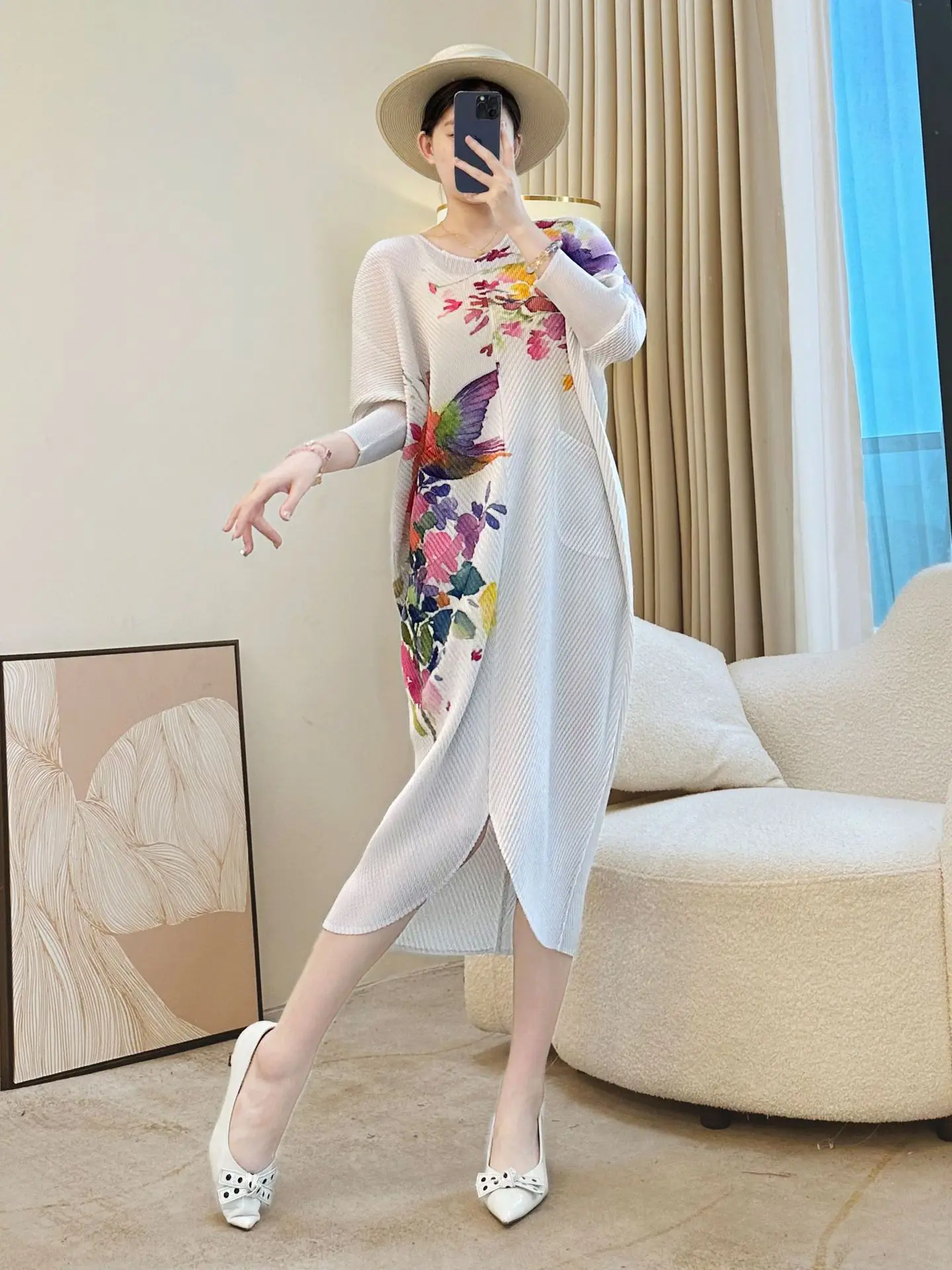 Noble Middle-aged Mother Casual Floor-Length Printed Long Dress Wide Breathable Bodycon Velvet Summer Miyake New